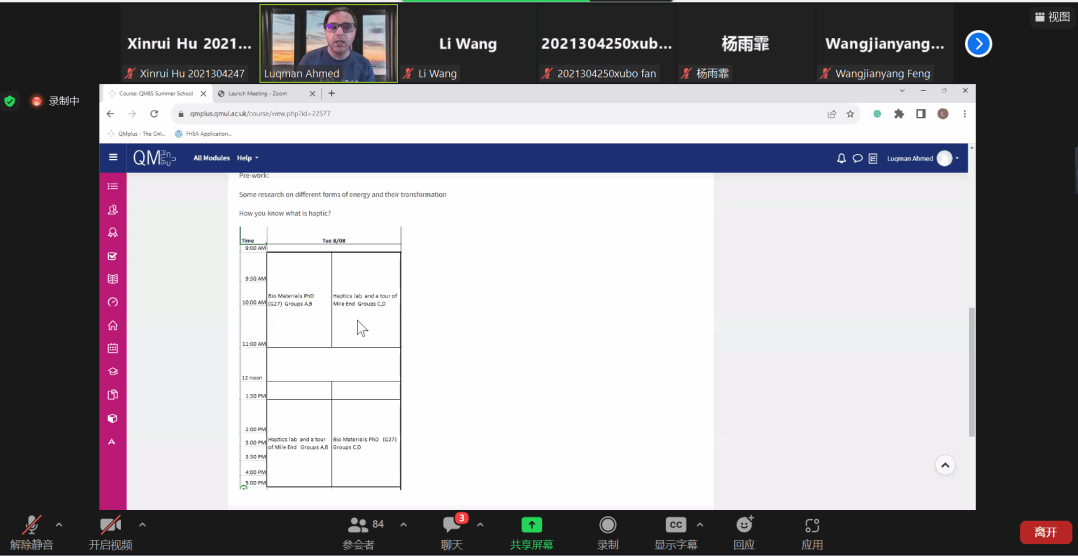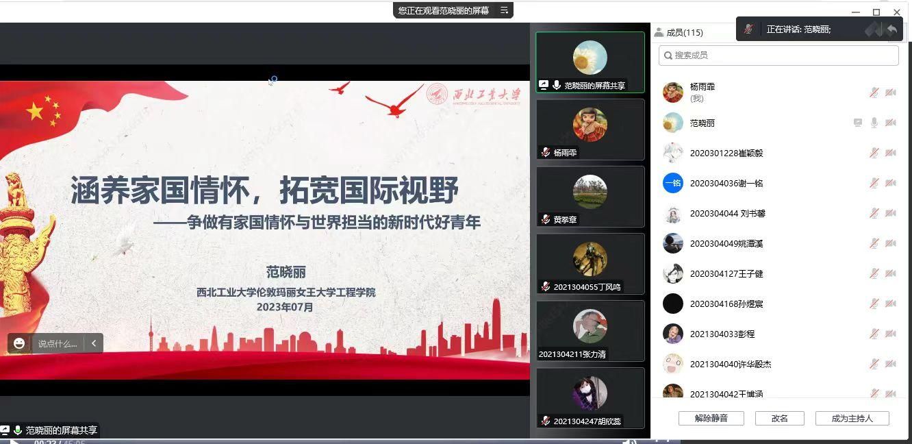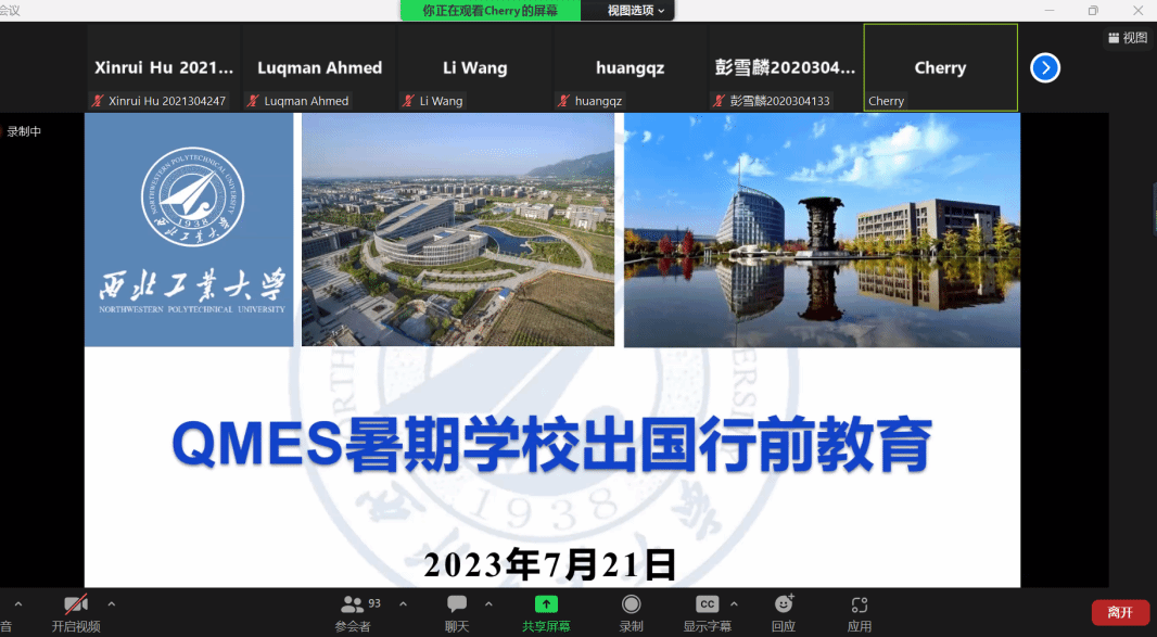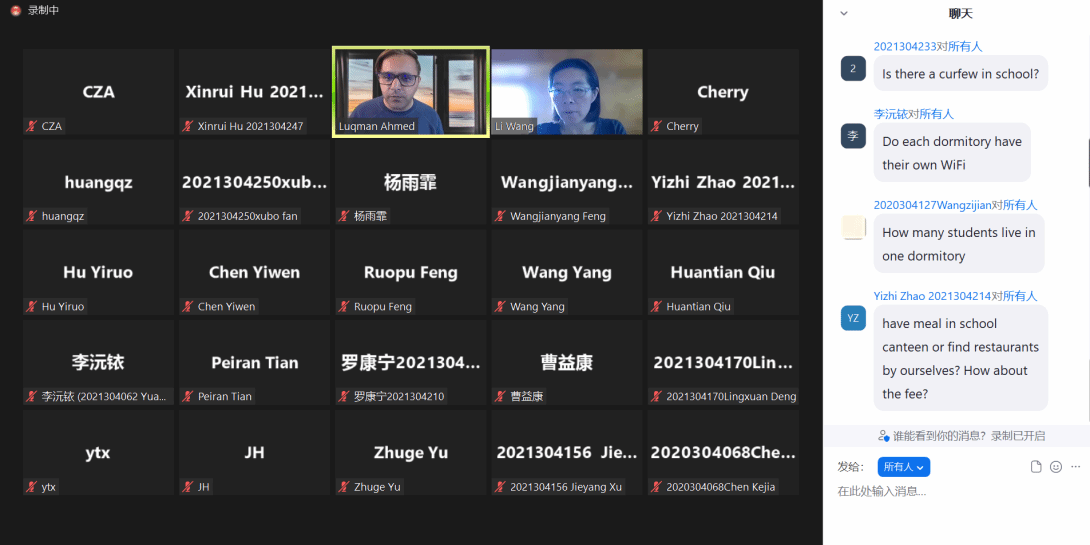 7月21日晚,QMES暑期公司出国行前教育会于线上进行。公司副经理程茵、员工事务办公室主任黄拳章、组织员杨雨霏,以及英方老师Luqman Ahmed、Wang Li、Chelsea及全体暑期公司同学参加了本次培训会。培训会由程茵主持。