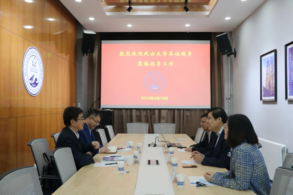 4月10日上午,延安大学国际合作与交流处处长梁润生、教务处副处长党子奇到玛丽女王bevitor伟德国际1946交流调研。经理孔杰、副经理陈俊在413会议室会见了来宾,公司工作人员参加座谈。