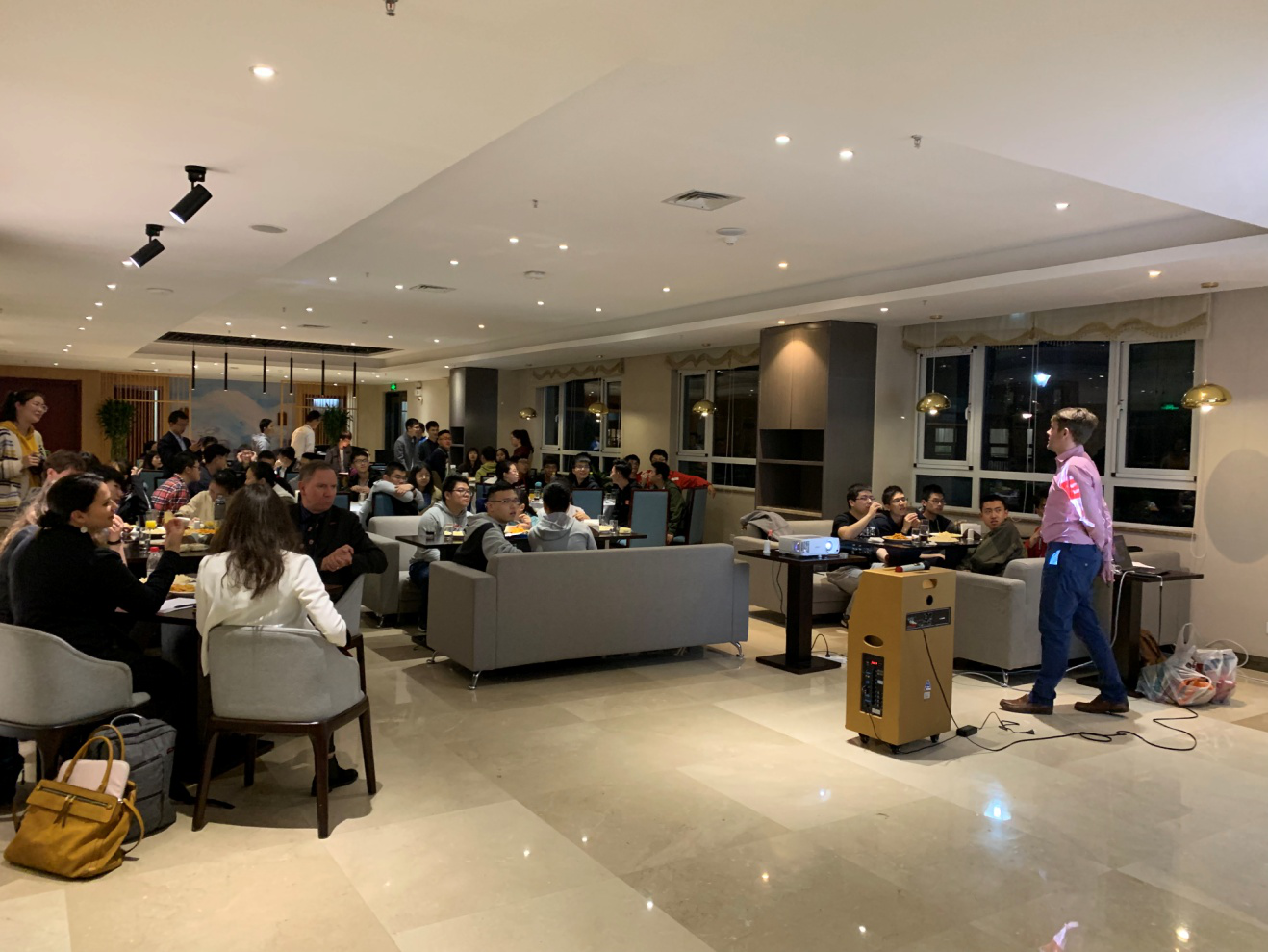 晚间,全体人员转至校内西餐厅,Julian Fisher带领大家进行了英式酒吧竞猜(British pub quiz)活动。同学们随机分组,就不同主题的竞猜题目进行了测试。内容涉及英国历史事件、文学作品、建筑标志、风土人情和中英两国政治、经济、文化交流合作以及双边关系展望等。同学们全情投入,愉快自如地参与互动,大厅里笑声、掌声、欢呼声此起彼伏。大家普遍认为,该学习方式新颖独特,过程轻松愉快,对新学习知识点的印象格外深刻,创新意识在不知不觉中得到升华。创业就业能力日系列活动取得圆满成功。