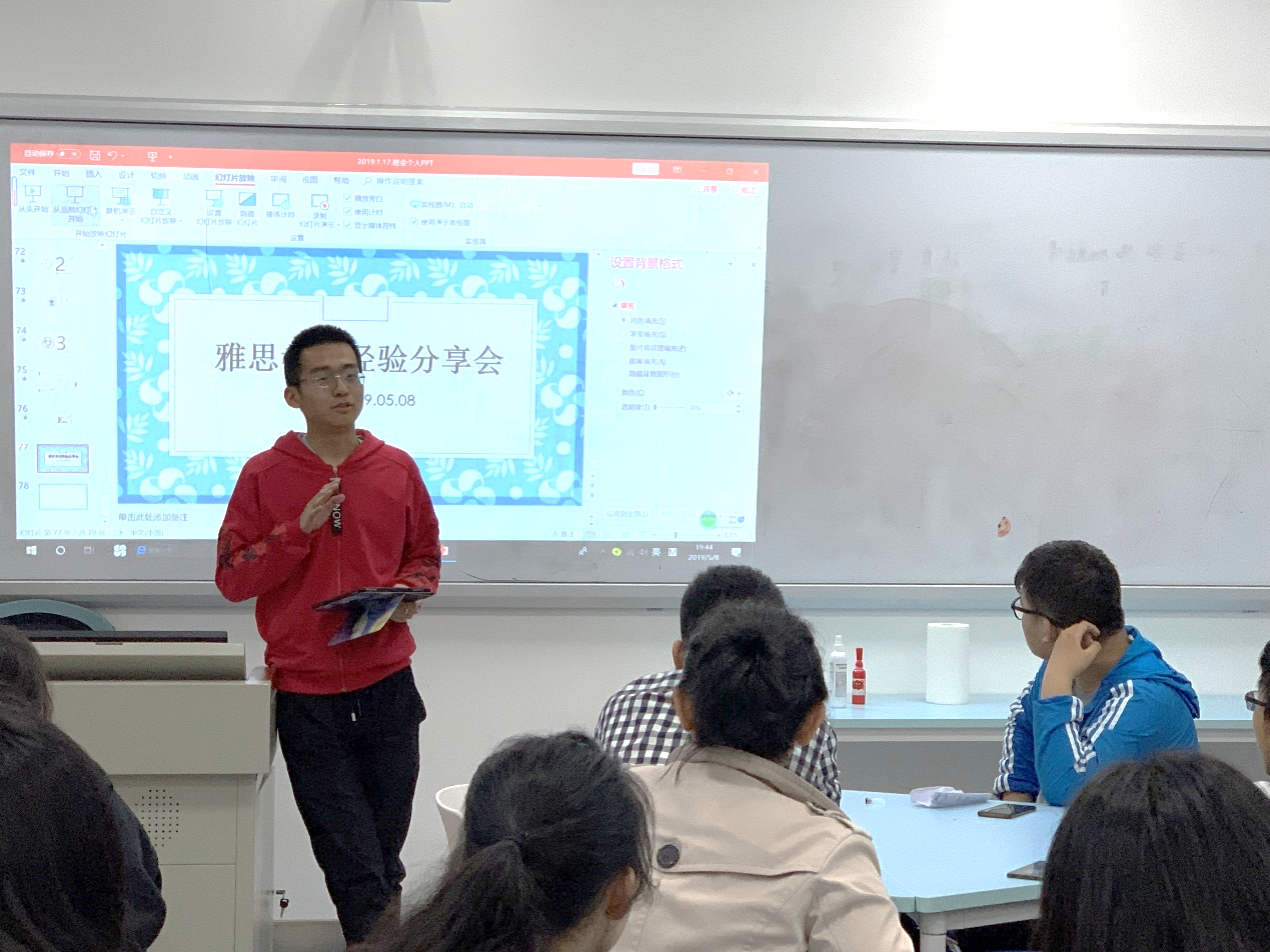 范峻丞同学来自公司2017级高分子材料与工程4班,他在雅思考试中取得了总分7分、听力单科8.0、阅读单科8.5的好成绩。分享会上,范峻丞同学介绍了雅思考试阅读部分的特点和难点,分享了提高阅读能力的技巧,指出了同学们在日常备考时应当注重的问题以及如何在日常学习和生活中提升英语阅读能力。