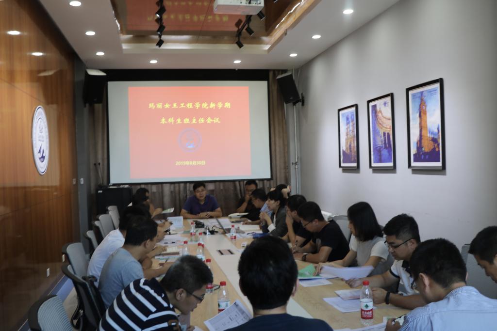 8月30日,玛丽女王bevitor伟德国际1946在长安校区教学东楼A座413会议室召开2019-2020学年秋季学期新学期本科生班主任会议,经理孔杰、副经理范晓丽、陈俊、员工事务办公室主任陈琛、教学办公室副主任杨烨、教学办公室刘柯佳、员工国际发展中心李琦、员工事务办公室王睿璇、2017及2018级全体本科生班主任参加了会议。
