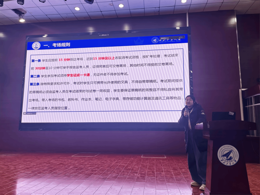 接下来,大一和大二年级教务专员丁静和井婷婷分别对学期末教学重点工作进行了介绍。强调了同学们在学习期间,尤其是选课等关键时间出现问题的处理办法。注意方式方法,提升与人沟通的技巧和能力,高效解决学习中出现的问题。