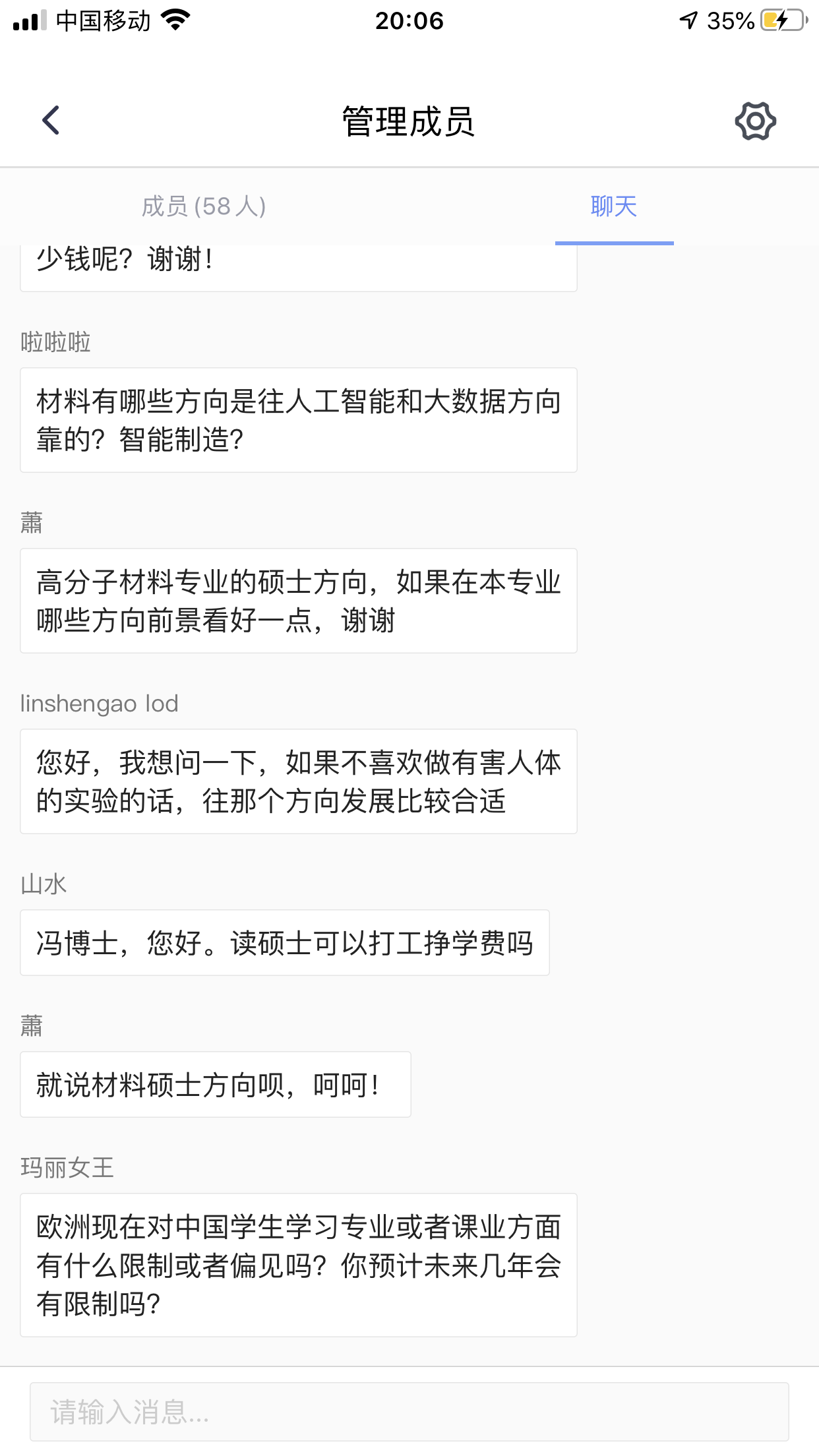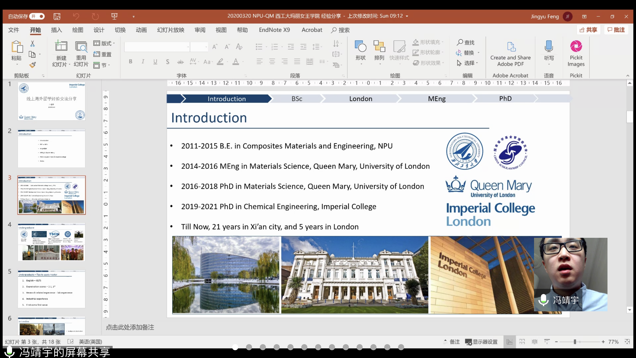 冯靖宇本科毕业于西北工业大学材料公司,随后赴英国伦敦玛丽女王大学攻读硕士,目前在伦敦帝国理工公司攻读博士学位。冯靖宇博士首先介绍了在伦敦玛丽女王大学和帝国理工公司的学习经历和体会。他表示,英国的授课方式与国内略有不同,往往围绕课程主题从最基础的部分讲起,新的授课模式令他受益匪浅。作为研究生,在科研方面要投入更多精力,同时加强与团队人员的交流沟通,共同努力,合作完成项目。冯靖宇博士结合自身经验,讲述了出国留学的一些常识和申请出国的主要渠道,希望同学们尽早确定自己的申请公司及专业方向,并与相关导师取得联系,不断提高外语水平和GPA分数,提前准备申请材料。最后,冯靖宇博士向现场的同学们送出祝福与鼓励,希望同学们能够在筑梦路上砥砺前行,在更加广阔的平台上,体验不同的文化,提升自身应对国际化冲击的综合能力。