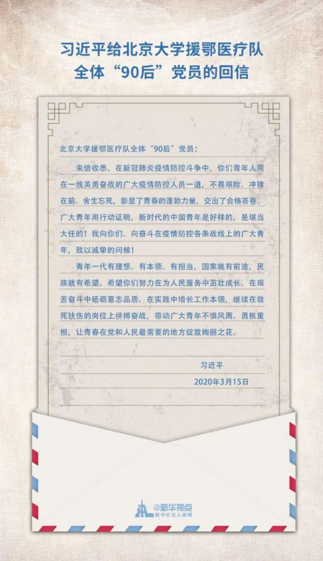 2020年3月15日,习近平总书记在给北京大学援鄂医疗队的青年党员回信中指出,青年一代有理想、有本领、有担当,国家就有前途,民族就有希望。习近平总书记饱含深情的回信中,对新时代的中国青年给予充分肯定,令各界青年深受鼓舞,引发学习热潮。
