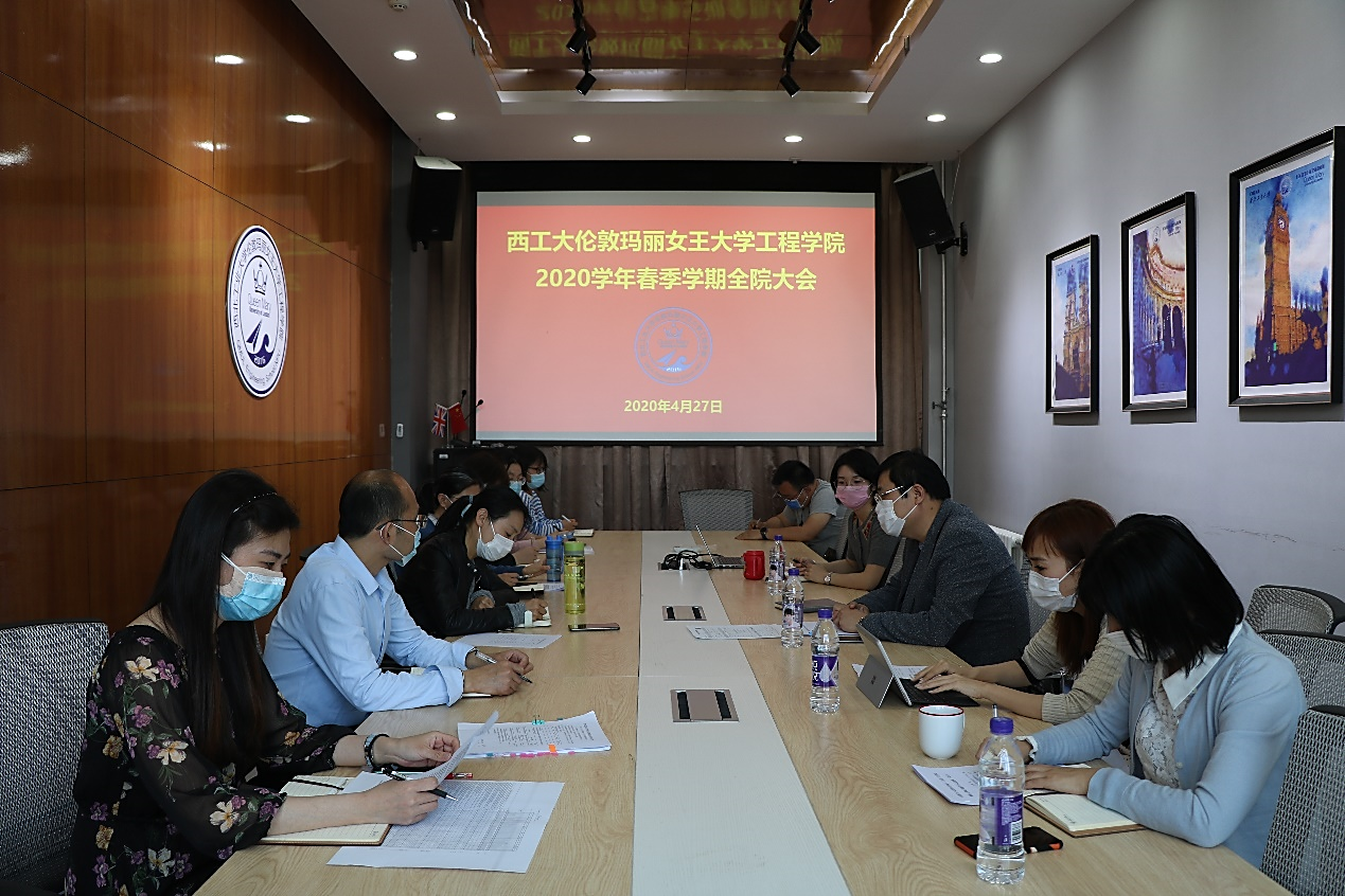 2020年4月27日下午,玛丽女王bevitor伟德国际1946在长安校区教学东楼A座413会议室召开全院大会,公司全体工作人员参加会议,孔杰经理主持会议。