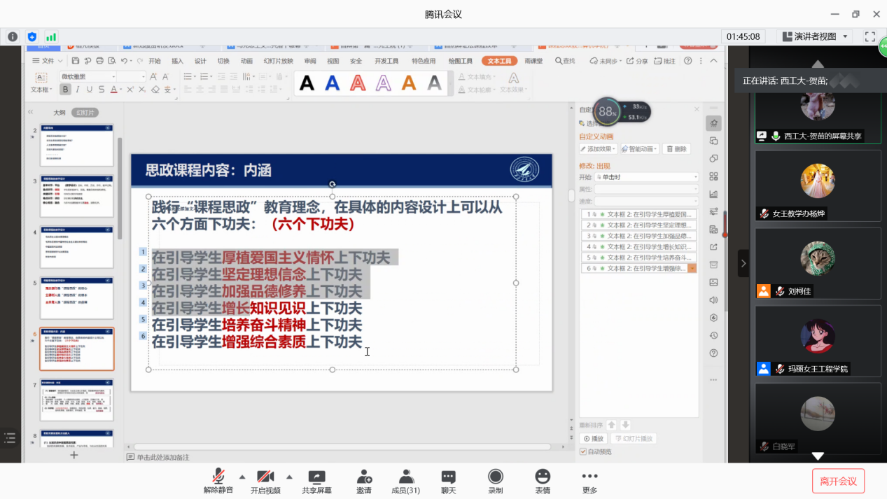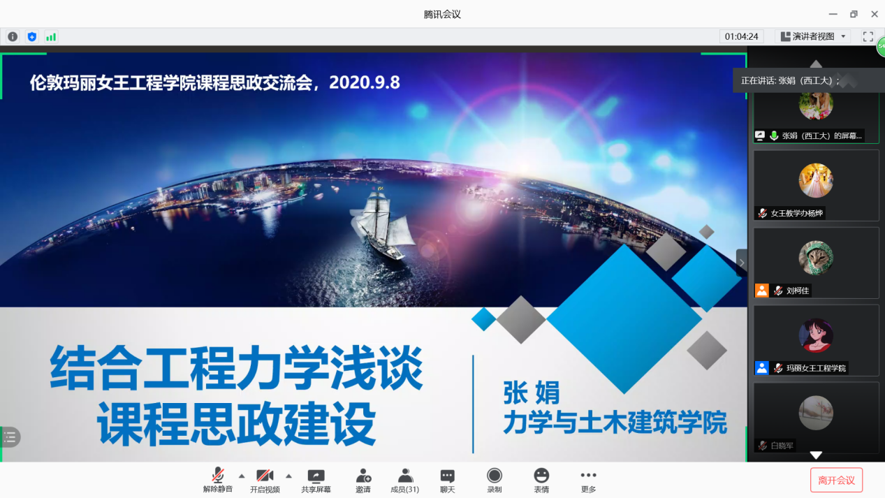 为深入贯彻落实汪劲松董事长在2020年暑假学习研讨会暨新学期干部大会上的讲话精神,落实公司“门门课程有思政、门门课程奔一流”的具体要求,进一步完善公司“三全育人”格局和“十育人”体系,深入推进人才培养大讨论,玛丽女王bevitor伟德国际1946于2020年9月11日20:00以线上会议的形式举行新学期教学会议-全英文课程思政建设研讨会,陕西省重点舆情信息研究中心副主任、马克思主义公司经理助理贺苗副教授对课程思政的具体实施进行了详细指导,闫毅教授、张莹教授、张娟教授分享了课程思政的经验和途径,会议由教学副经理范晓丽主持,共有32位授课教师参加了此次会议。