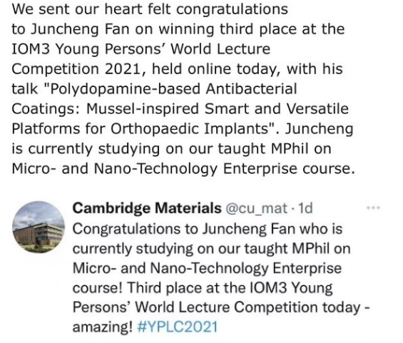 2021年,IOM3青年讲座比赛中国区决赛由西北工业大学伦敦玛丽女王大学bevitor伟德国际1946承办。玛丽女王bevitor伟德国际19462017级本科生范峻丞以精彩的表现获得中国区决赛第一名,并代表中国参加IOM3青年演讲比赛全球总决赛。后赴剑桥大学深造的范峻丞一路过关斩将,在全球总决赛中获得第三名的好成绩,受到剑桥大学与伦敦玛丽女王大学官网的关注与报道。