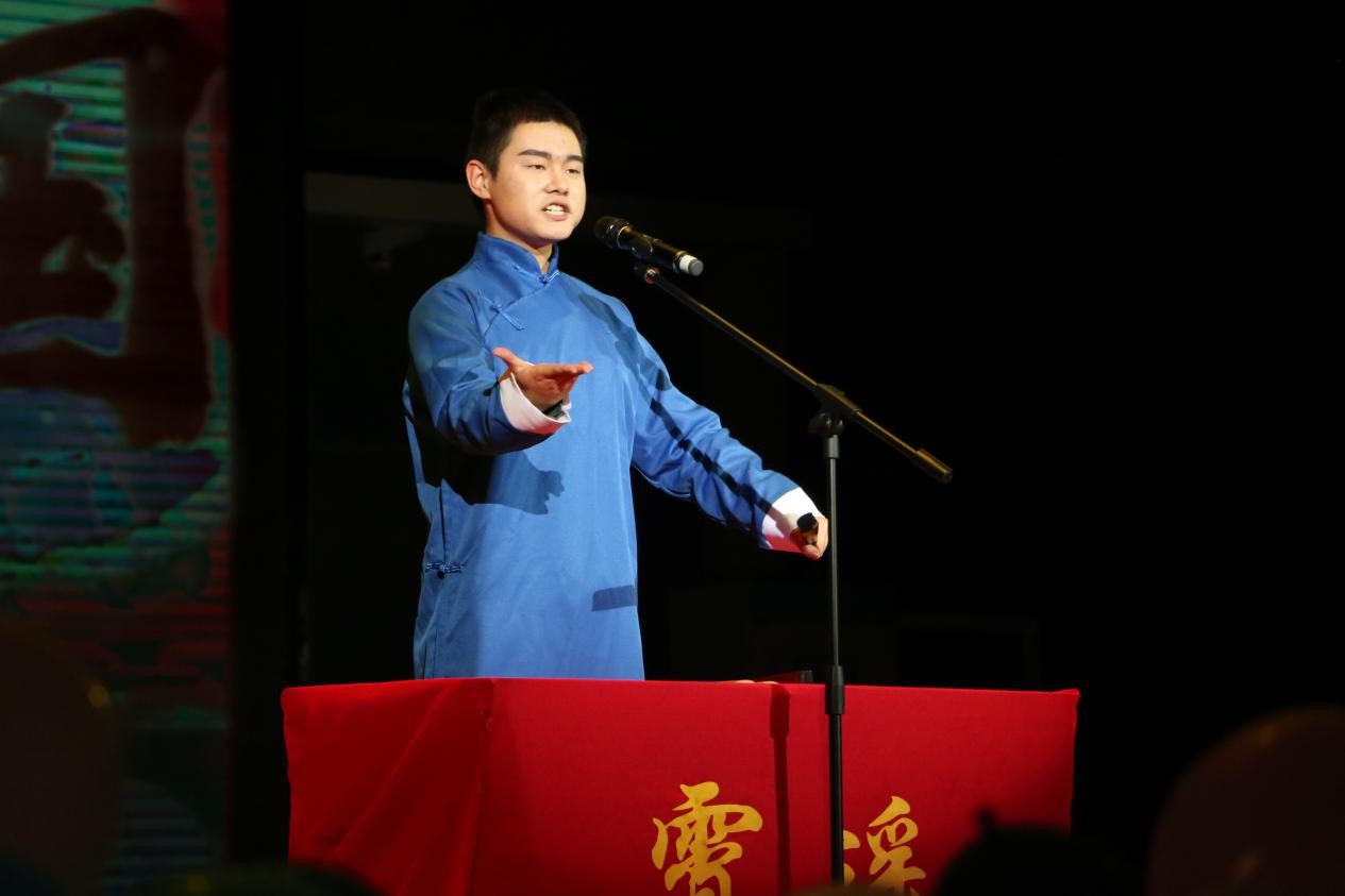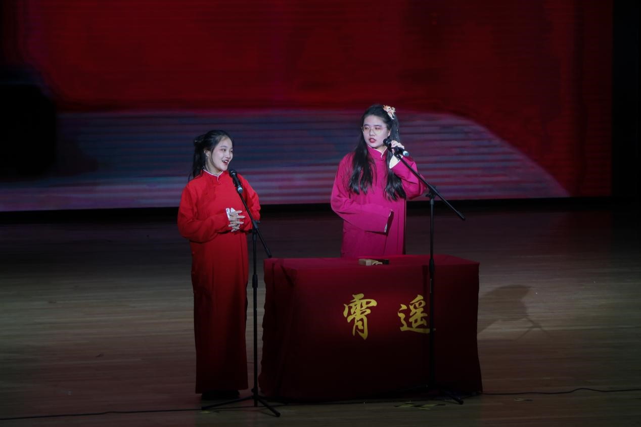 相声,是扎根于生活的表演艺术;春联,是中华民族优秀传统文化的重要组成部分。贺荻萱和武成欣两位同学表演的相声《对春联》,将古典与当下生活结合,既传诵经典文化知识,又表达两院学子“学好外语,同时不忘根本”的坚定信念。正所谓“学逗相声巧,因缘啼笑真”,嬉笑诙谐处,涵义隽永。
