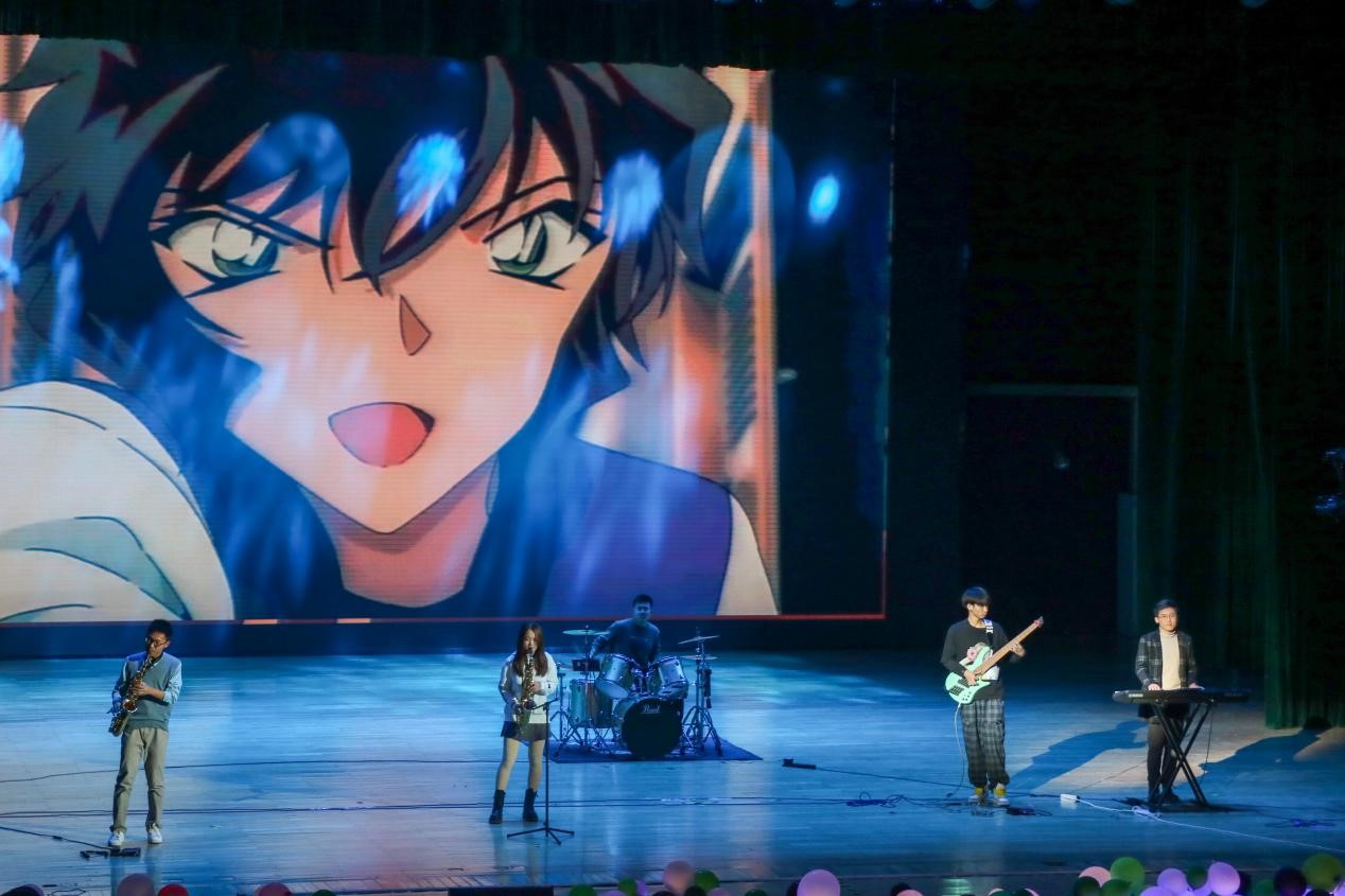 还记得儿时最向往的高速滑板,麻醉手表,变声领结吗?彭梓洋、杨苏智、齐翊博、冯韵淋、吴浩冉带来的合奏《名侦探柯南》引起全场观众的共鸣。架子鼓的节奏一响起,就引发了阵阵欢呼与掌声,萨克斯吹出的曲调颇具古典风范,饱含着“正义”与“真相”,精彩的推理呼之欲出,那句“真相只有一个!”似乎就在耳畔。翱翔员工中心的夜晚仿佛把我们带回了童年!