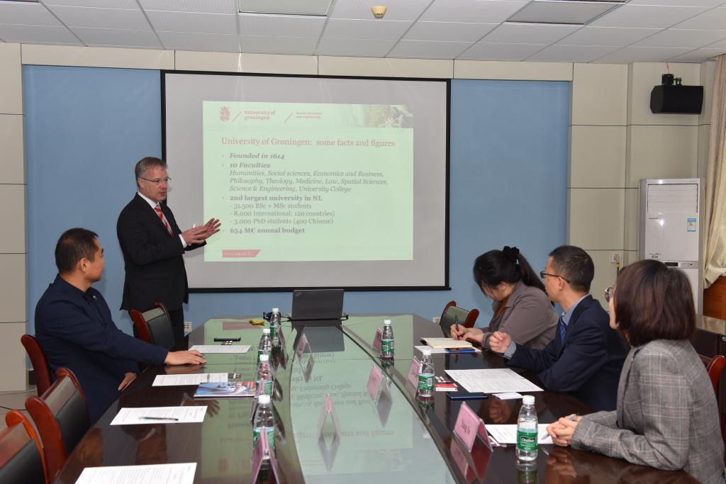 荷兰格罗宁根大学Marc van der Maarel教授对受邀参加西北工业大学系列活动表示感谢,并详细介绍了格罗宁根大公司史校情、院系设置以及学科特色,特别是中国职工在格罗宁根的学习和生活情况,希望能有更多的西工大学子赴格罗宁根交流和学习。