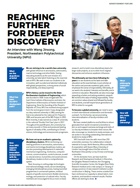 《自然》(Nature)杂志用8页的篇幅重点介绍了西北工业大学航空宇航科学与技术、船舶与海洋工程、材料科学与工程、机械工程及其力学基础、信息科学等优势学科及柔性电子、语音识别、脑科学、特殊环境生物学和生物医学工程等新兴学科方向。同时,还向全世界的科技工作者宣介了西北工业大学的人才政策。