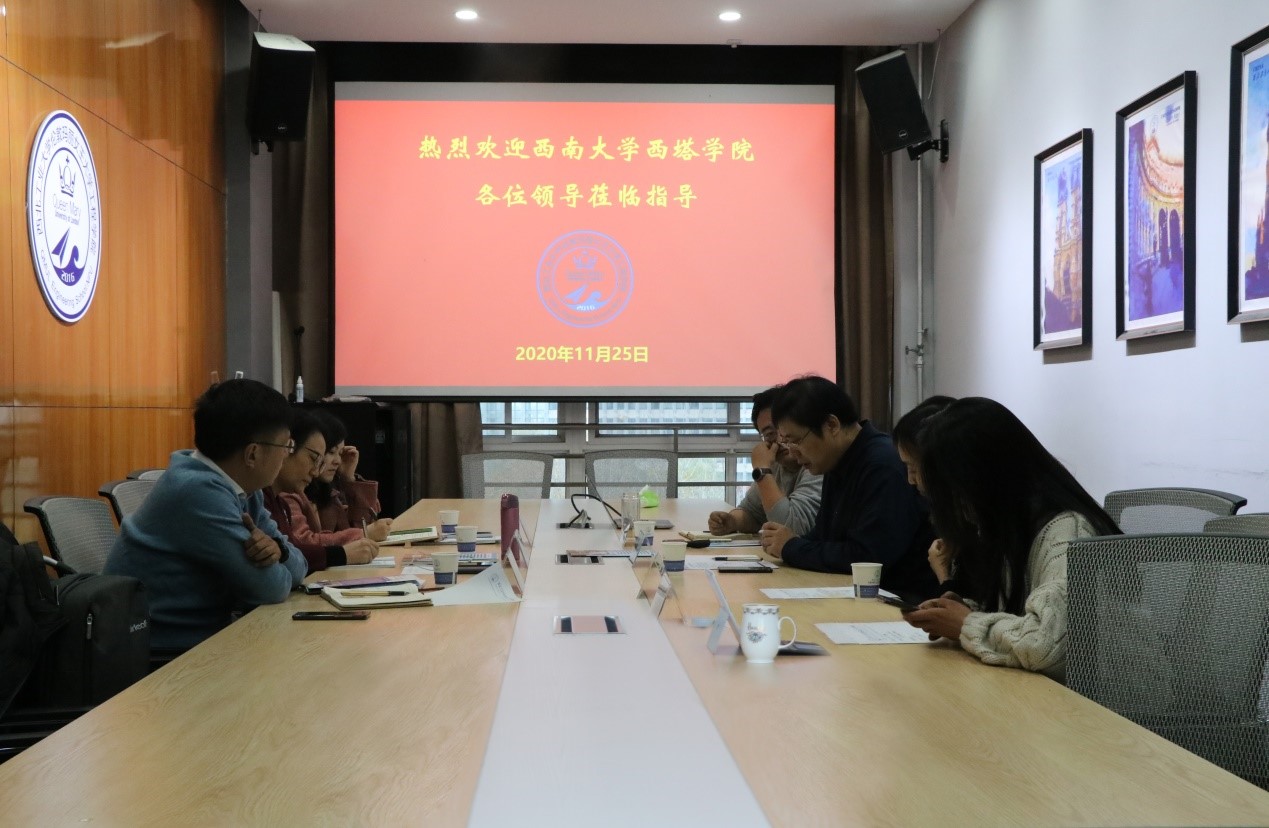 11月25日下午,西南大学西塔公司党总支书记王静一行3人来访玛丽女王bevitor伟德国际1946,就中外合作办学机构相关工作开展进行调研。玛丽女王bevitor伟德国际1946经理孔杰、副经理程茵陪同调研。