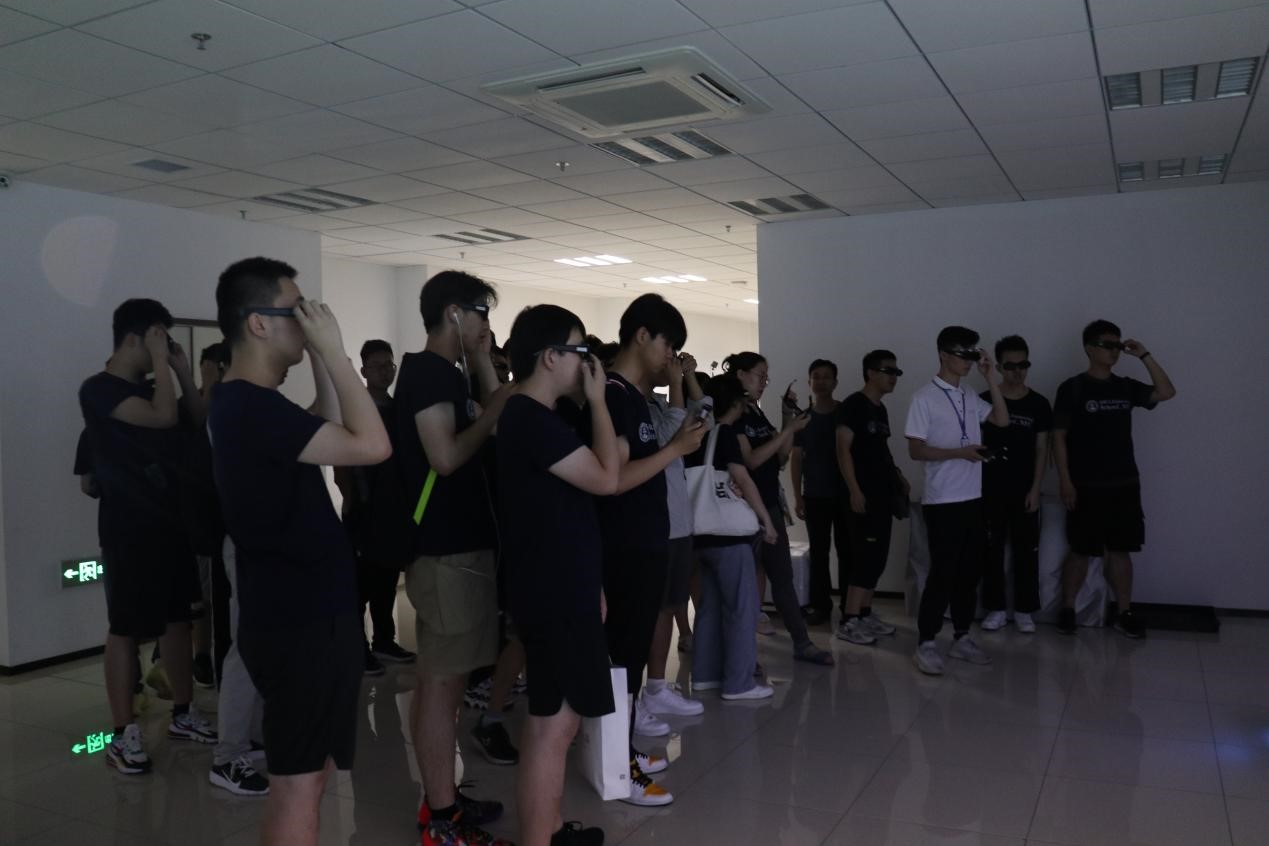 参观完航空产业园后,参观了公司下属的长三角研究院,同学们此行情绪高涨,跃跃欲试。进入大楼正门,便远远看见西工大党支部的红旗像火一样飘扬。在负责人的带领下同学们先是来到了研究院的孵化企业嘉创飞航、域圆科技等。接待负责人热情寒暄过后带着大家参观了公司的研究成果,嘉创飞航主要致力于开发无人机;域圆科技主要研究教育领域的VR(虚拟现实)技术,介绍人给大家展示了神奇的VR技术,戴上特制的VR眼镜后,便能看见本该在平面的图形十分逼真地出现在三维世界中,眼前似乎都能触摸到实物。介绍人向同学们解释道:“这些技术基本上都应用于教育领域,如中小学的虚拟仿真课堂,课本中的动植物可以直接在孩子们眼前‘活过来’……”他还让公司的其他工作人员向大家展示了一些医学领域中的应用。随后,同学们还尝试了仿真模拟飞行器驾驶以及仿真赛车驾驶,这些都能通过VR技术与自动控制系统实现。