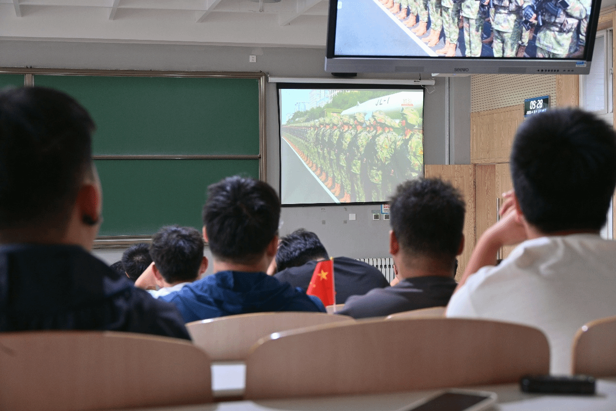 9时整,大会正式开始。在庄严的国歌声中,全体师生起立。大家目不转睛地观看屏幕,深切感受中国军队不可撼动的钢铁意志与磅礴力量,深刻领会伟大抗战精神的历史意义。
