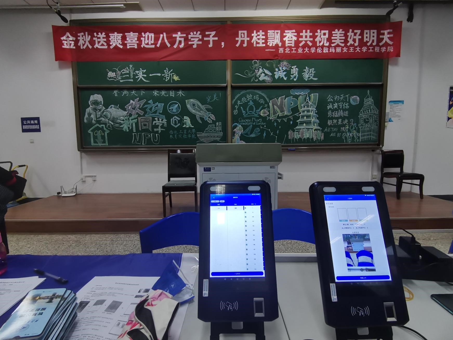 在9月8日迎新内场,还有一群身穿志愿者服装的2022级新同学。他们在提前到校办好入学手续后,继续留在迎新现场,向其他新同学讲解报到流程,帮助发放物资,办理签到。同时,心灵手巧的新生志愿者们还在忙碌之余绘制了迎新内场的板报,让报到现场的氛围倍加温馨。