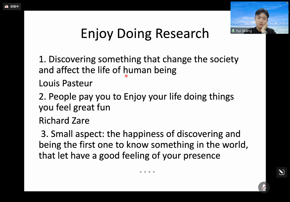 尚睿教授主要为同学们讲解了自己从本科至今的研究课题,并与大家分享了自己在科研道路上难忘的回忆与宝贵的收获,除了让大家对有机合成及催化有了一定的了解外,也让同学们明白做科研不是只有枯燥与乏味的实验,还有与人交流时的快乐、开拓眼界时的美好。尚睿博士特别指出,同学们在本科阶段也要勇于挑战、敢于创新、不畏困难,找到科研的乐趣、享受探索未知的过程、肯定自我的价值。