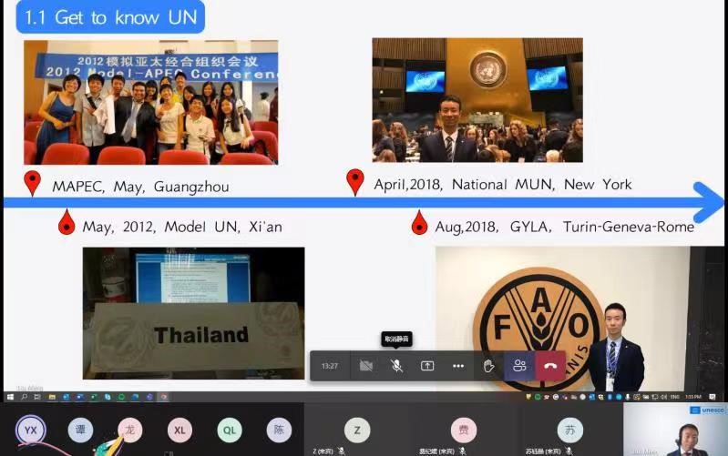 在当前的特殊国际环境下,刘蒙老师深入浅出地介绍了联合国的发展历史、现况及组织架构,和同学们分享了对联合国和国际组织工作的新认识、新思考,助力中国青年走向世界。刘蒙老师提到国际组织的重要性以及在国际组织任职的意义,同时根据自身在国际组织任职的丰富经验,解读国际公务员的定义和职责。他强调成为国际公务员所需的核心素养以及青年员工如何培养自身素养,成为具有家国情怀、熟练运用外语、通晓国际规则、精通国际谈判、具有全球视野的新时代青年。
