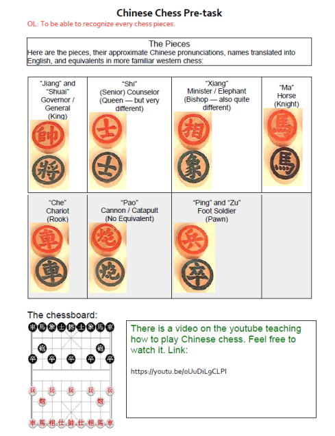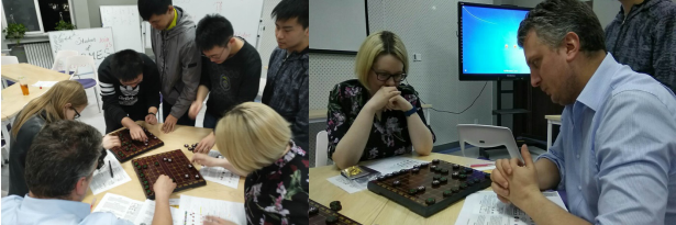志愿者团队对此次课程的热情度极高,做了充分的准备,收集资料、研究内容、编写教案、制作讲义,还购买实物计划现场教学,甚至还效仿老师们平时给他们布置课前作业那样—准备课前预习任务。4月11日,三位英语老师:Alan,Faith 和Agne参加了第一堂中国象棋的课程。志愿者团队向他们详细介绍了中国象棋的历史、棋盘棋子的样式和分布,以及对弈规则等内容。随后,Faith老师在随堂测验中回答正确,赢得了一套中国象棋纪念品。而在之后进行的Alan和Faith两位老师的正式对弈中,Alan老师历经两个多小时,最终取得了“世纪对决”的胜利。在旁观战的Agne老师形容“对弈太紧张了,房间里一片寂静”。