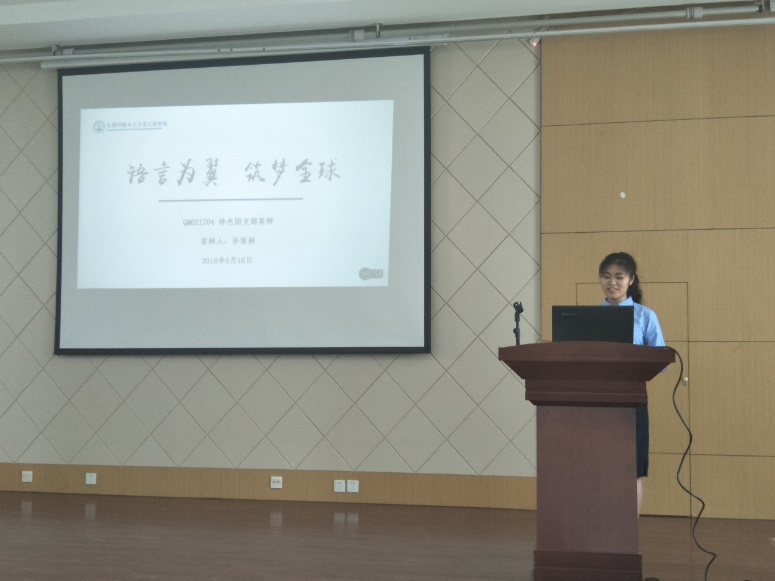 This presentation was divided into three parts, ideological guidance, learning atmosphere constructions, arts and sports activities. In terms of Ideology Guidance, the branch took part in compiling the 19th CPC national congress bilingual report, listened to the English party lecture, organized reform and opening up forum. The May 4th Youth Day we studied President Xi’sspeechin Peking Universityon May 2. We also organized a lawn reading, studied the spirit such as training students' political quality and ideological awareness. In the aspect of learning atmosphere construction, the students in the branch have enthusiasm and positive attitude. In the past mathematical modules competition, six students participated in and all of them won the prize, including two first prizes, three second prizes and one third prize. We also encouraged classmates to take part in the "nano-technology introduction" of Professor Colm Durkan from Cambridge, to expand our professional knowledge and broaden horizons. In terms of arts and sports, our branch had organized students to visit the aircraft engine laboratory. Besides,all theladies gave a dance show at the welcoming party in last December. In this April,on behalf of JEI,two representatives from our class are elected to attend the international student forumin Sichuan University. In addition, there are some other activities for relaxing like hiking.