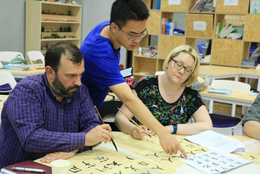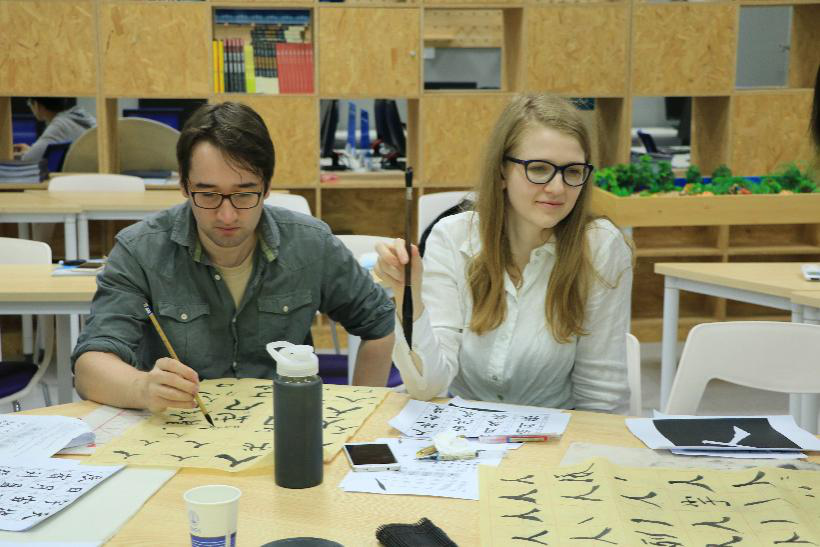 Alan和Matthew则显得谦逊而虚心,他们一边临摹字体,一边请教着书写技巧和笔画顺序。Agne和她的“中国通”男朋友则展现出了对汉字的极大兴趣,不断向志愿者服务队的同学们询问着新的汉字写法,像“你”“我”“英”等等,练习愈多,愈感其乐无穷。