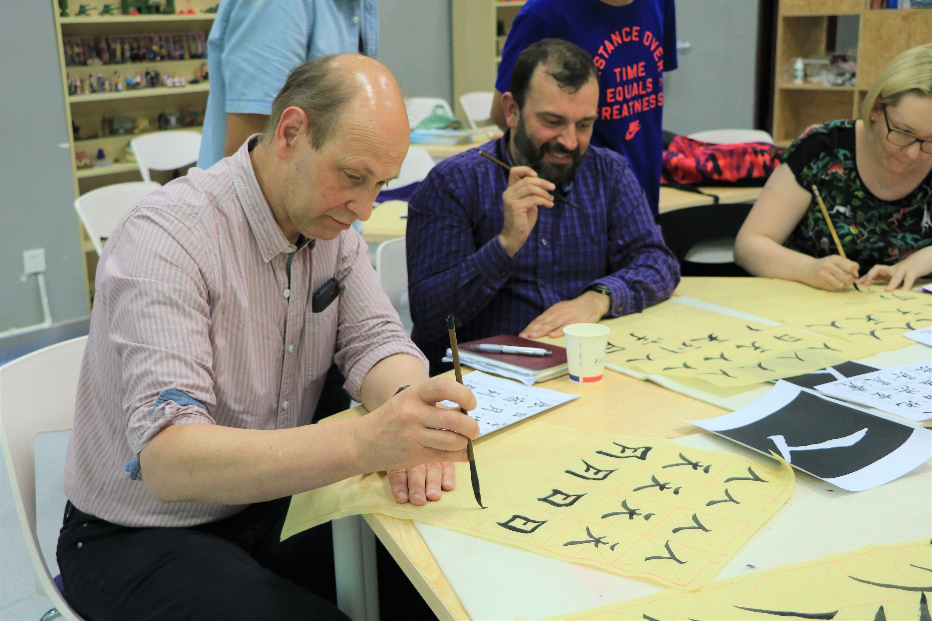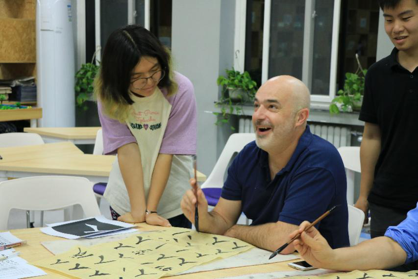 最后,就是最最激动人心的实践环节了!蔺琬然同学首先示范了握笔方式,并规范工整地书写了“人”字。此时的外教们已经跃跃欲试,执笔临摹,泼墨挥毫。Andrew展现出了强大的书法天赋,握笔姿势显得非常专业,写出的字也有几分native 的味道。Gabriel则是延续了俏皮的本色,将自己的性格融入到书写方式中,写出的人字也是充满活力,活泼生动而顽皮可爱。
