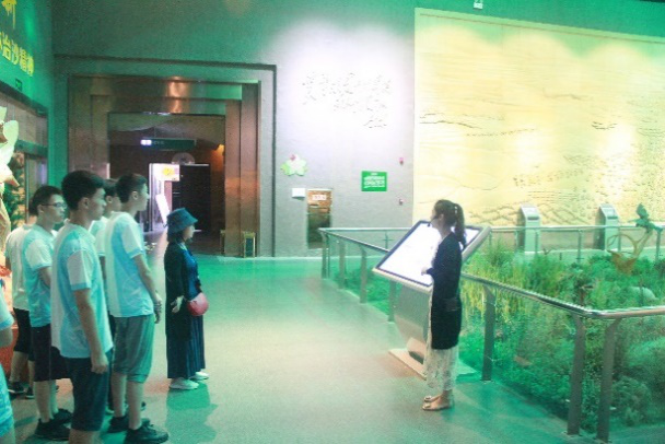 8月18日上午,实践队到达位于榆林市空港生态区内的榆林市林业展览馆,详细了解榆林荒漠化治理的前世今生。榆林林业展览馆总面积3528平方米,俯瞰呈树叶状,五片相连。展览馆犹如一双手,五个手指分别代表建设厅、沙漠厅、生物厅、产业厅、4D影院等五个主题馆。手掌底部是一块刻有“治沙赋”的浮雕,简明向参观者介绍了榆林治沙的宏伟蓝图。在讲解员的带领下,队员们在展厅领悟了榆林治沙精神,认识了三位榆林地区治沙英雄——牛玉琴、石光银、李守林,欣赏到描述榆林地区环境变化的巨幅壁画“北治沙”。