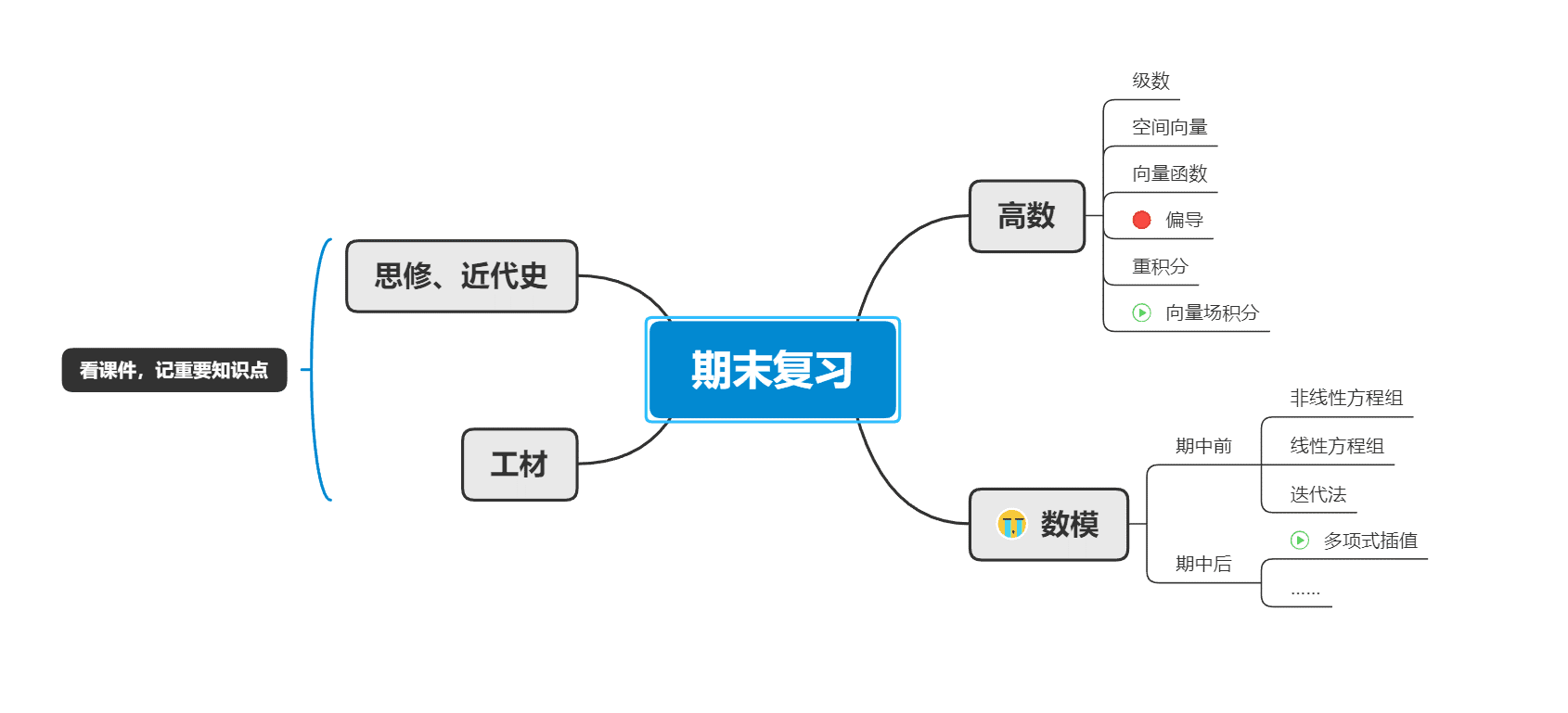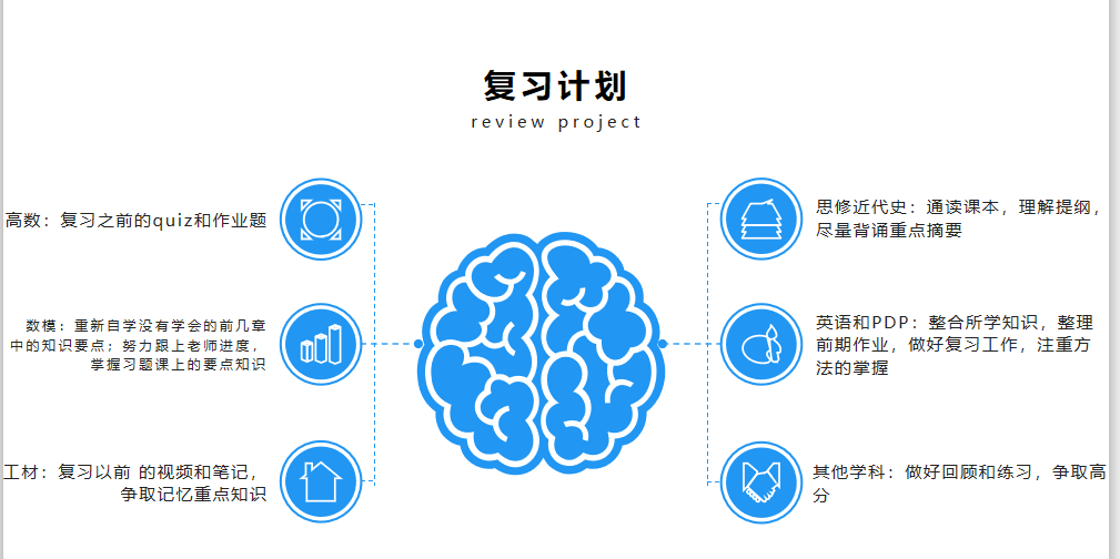 几位同学就“思维导图”学习法进行了介绍和详细展示。李洵昊同学用一个思维导图,形象地向同学们展示了期末考试科目的章节和重点,并为同学们展示了思维导图的具体使用方法,将每个科目复习重点进行标序,从宏观和细节两个层面对知识点建立牢固的记忆。姜思成同学也进一步用一个思维导图向同学们展示了复习的方向,列举出了每门学科的复习突破点,并阐述了后续复习方向的整体规划,缜密而有逻辑。万生豪同学总结了思修和史纲的复习规划,并提供了一个思维导图软件,该软件可快速制作相关思维导图,进一步方便了同学们复习计划的制定。此外,他还根据自己的学习经验推荐了多个优质慕课,用于同学们对课上知识的查缺补漏。同学们表示这些学习方法实用有效,后面将尝试使用该方法进行期末考试知识的梳理和复习。