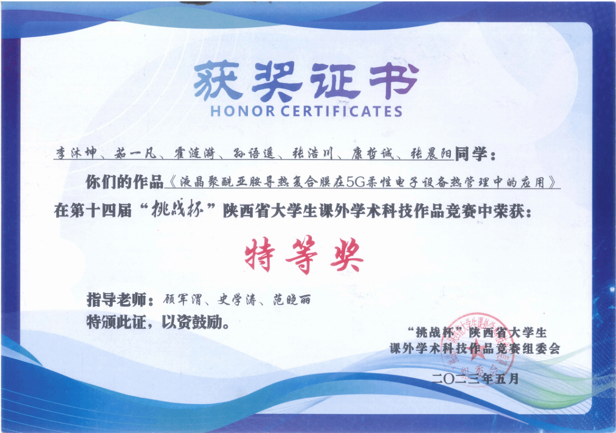 “液晶聚酰亚胺导热复合膜在5G柔性电子设备热管理中的应用”是由公司本科生李沐坤、茹一凡、霍涟漪、孙语遥、张浩川、康哲诚和化工公司张晨阳等组成的项目团队。项目聚焦聚酰亚胺(PI)本征导热系数低、高导热填料下PI导热复合膜力学性能差、加工困难等关键技术瓶颈,采用液晶分子对碳纳米管进行表面功能化改性(LC-CNT)并在交流电场作用下与本征导热液晶聚酰亚胺(LC-PI)基体复合,制备出兼具优异导热性能、力学性能与耐热性能的LC-CNT/LC-PI导热复合膜,导热系数达4.02 W/(m·K),实现了PI导热复合膜在5G柔性电子设备热管理领域应用的技术突破。团队成员大胆实践创新,敢于探索尝试,不断提高综合能力,增加项目的竞争力。项目负责人李沐坤同学团结项目成员,统筹协调工作,在明确的合作分工下,将成员优势充分发挥。在顾军渭、史学涛、范晓丽老师的悉心指导下,团队逐渐成长,项目更加成熟,并在决赛中摘得特等奖殊荣。未来,项目团队将进一步与企业签订合作协议,扩大产品生产规模,推动产品的应用和推广。真正将科学创新与技术应用相结合,展现出玛丽学子积极创新创业,锐意进取的青春风采。
