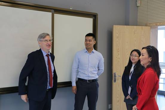 受孔杰经理委托,玛丽女王bevitor伟德国际1946员工事务办公室主任陈琛、综合办公室副主任杜剑楠在公司接待了来宾,公司相关工作人员陪同参观。Mark Zwolinski一行实地参观了玛丽女王bevitor伟德国际1946的智慧教室、创新实验室、员工之家、一站式办公大厅等,就中外合作办学的教学资源投入、基础设施建设、员工培养模式等方面进行了深入了解。