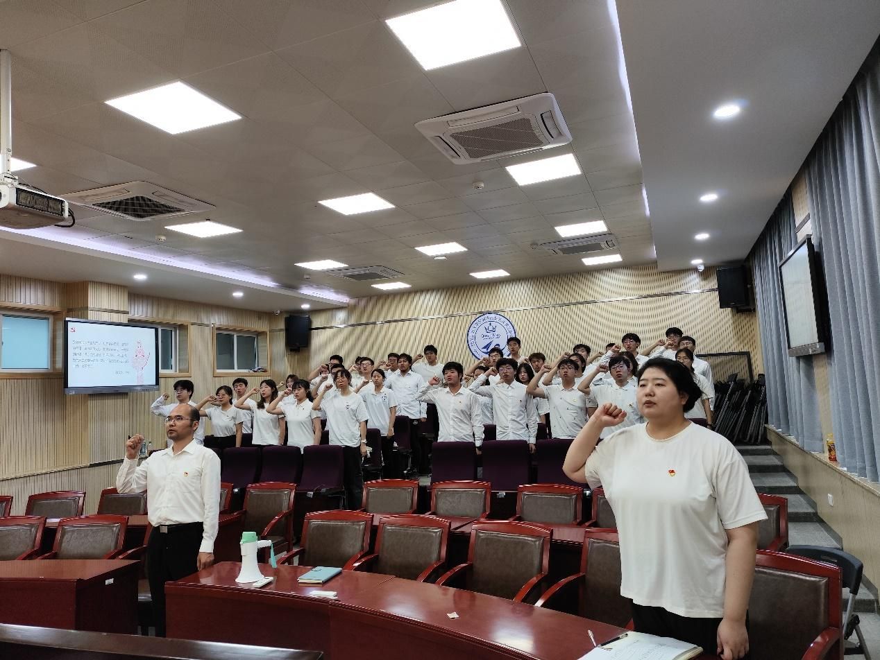 伴随着激昂庄严的《国际歌》,宣誓仪式正式拉开帷幕。首先,党支部书记黄拳章对新加入党组织的成员表示祝贺,接着支部党员王睿璇老师宣读了宣誓人名单,随后在支部书记黄拳章的带领下,34名预备党员面向党旗庄严宣誓,许下为共产主义奋斗终身的誓言。