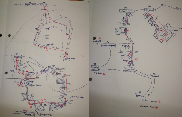 In the very beginning first, we were determined to get the champion. So before the scavenger hunt in London, we did a lot of preparations. Firstly, we found where the place was that we needed to take photos with on the underground map. After that, our laborious group leader drew the route on paper and madea perfect design to help us get the first prize.