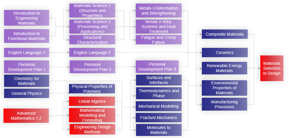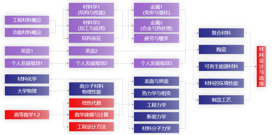 In accordance with the aim “to develop qualified and innovative talents who can study and work transnationally with the knowledge of natural science, materials science and engineering, and social science. Students graduate with comprehensive qualities, high professional competencies, a global horizon, a life-long study ability, and the recognition to international rules”, major courses are divided into several modules, support and linked with each other, emphasizing on principle specialty, meeting the education standard of professional, composite and entrepreneurial talents.