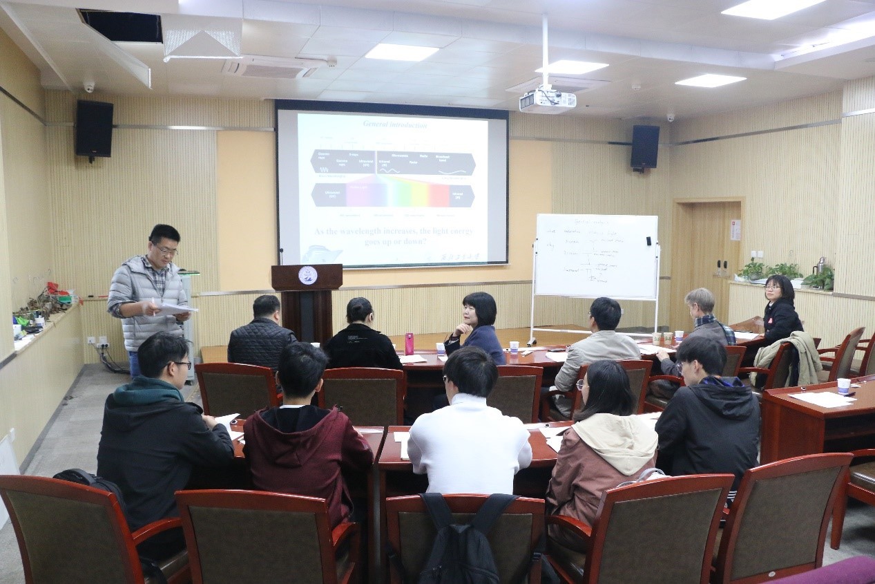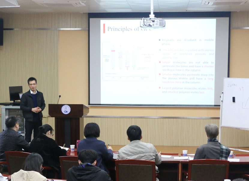 Combined with a comprehensive and diverse teaching model. The three teachers performed an all-English classroom simulation within 10 minutes, demonstrating their profound knowledge reserve and excellent teaching ability.Zhang Junliang, teacher ofPolymer Characterization, briefly introduced Gel Permeation Chromatography (GPC).He started the lecture from several aspects, such as the material size of polymer, the temperature of glass transition, the relationship between temperature and chain length, and the function of GPC, which strengthened students’ understanding of GPC.