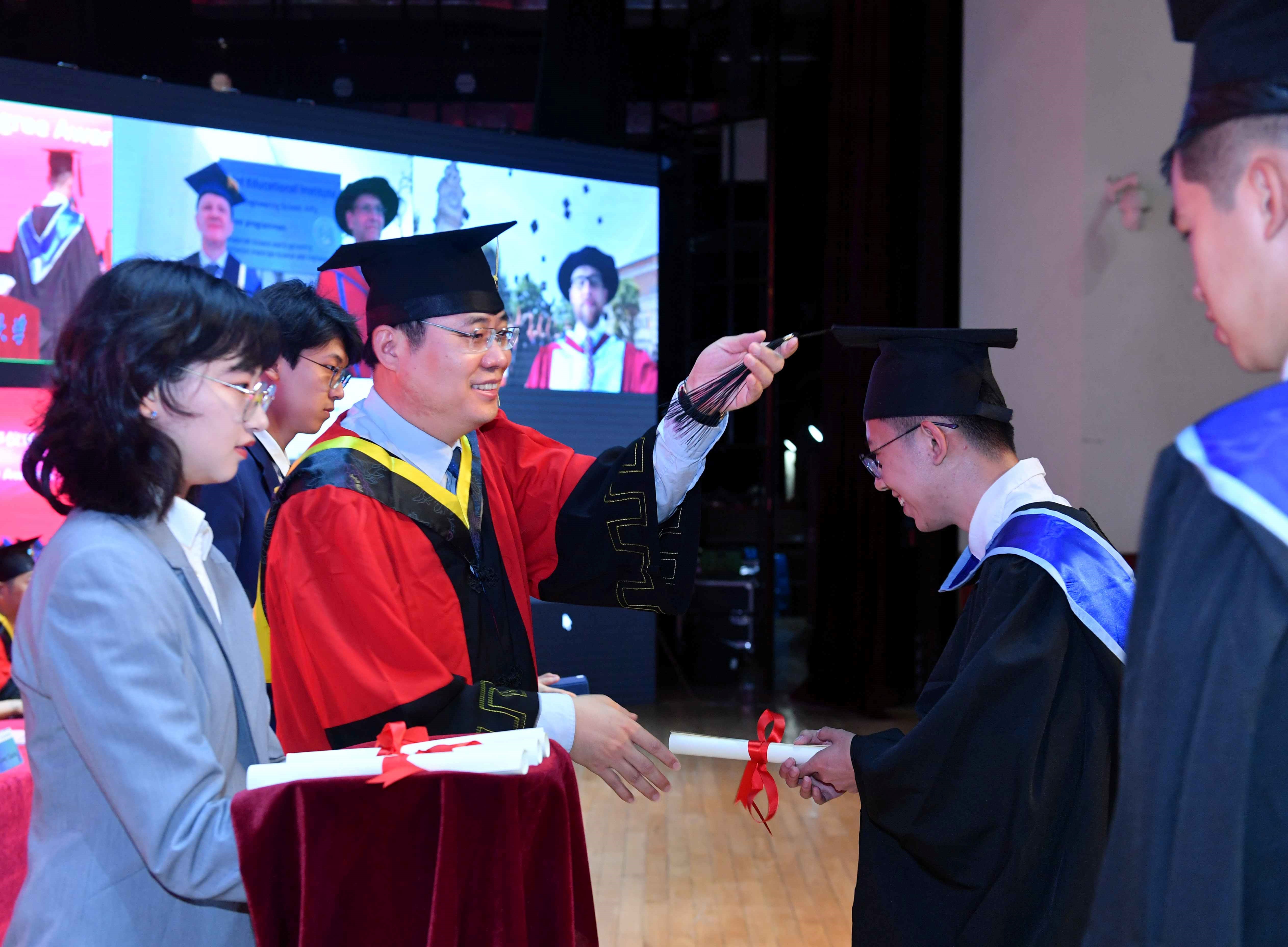 Under the recognition and blessing of both Chinese and British alma maters, Vice Dean Fan Xiaoli announced the list and degree level of the graduates. Under the witness of President Colin Bailey and Executive Vice Dean Andy Bushby, Dean Kong Jie distributed degree certificates to 220 graduates on behalf of QMUL. Dr. Deng Xinru, on behalf of QMES, issued exclusive commemorative seals to the graduates.