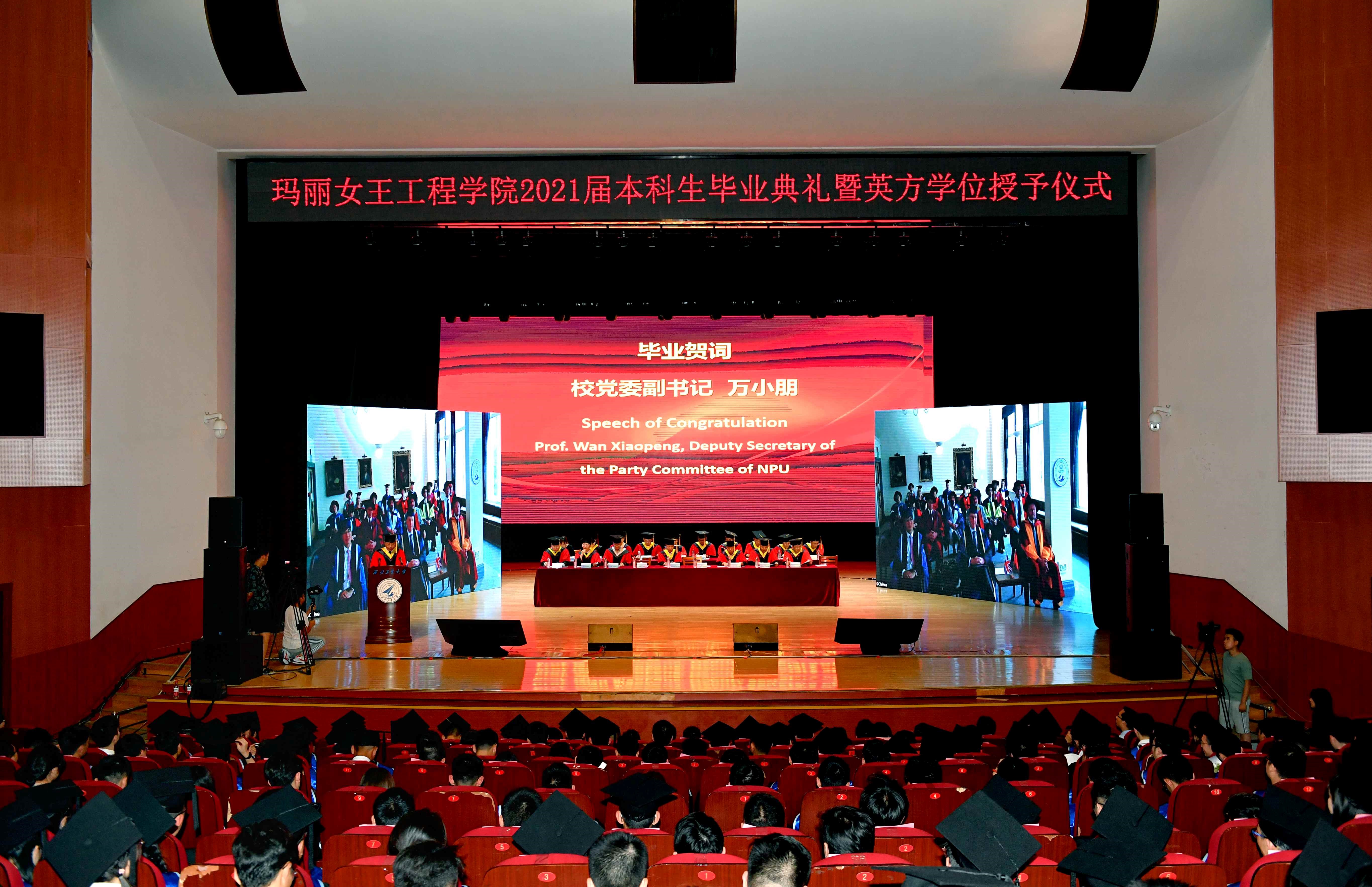 On June 21, QMES held the Undergraduate Graduation Ceremony and the British Degree Awarding Ceremony for 2021 graduates. Colin Bailey, President of Queen Mary University of London; Wan Xiaopeng, Deputy Secretary of NPU Party Committee and Chair of the Joint Administrative Committee (JAC); Wang Wen, Vice Principal of QMUL and Vice Chair of JAC; Colin Grant, Vice Principal of QMUL; JAC member and Vice Chief Accountant of NPU; JAC member and Dean of School of Materials Science and Engineering of NPU; Director of Development and Planning Department of NPU; Deputy Directors of International Cooperation Office of NPU; Secretary General and Deputy Secretary-General of NPU Education Foundation; Party Secretary of School of Materials Science and Engineering of NPU; Dean of School of Mathematics and Statistics of NPU; Vice Dean of School of Chemistry and Chemical Engineering of NPU; and all the faculty and staff of QMES attended this graduation ceremony simultaneously in Xi’an and London. The ceremony was presided over by Kong Jie, Dean of QMES.