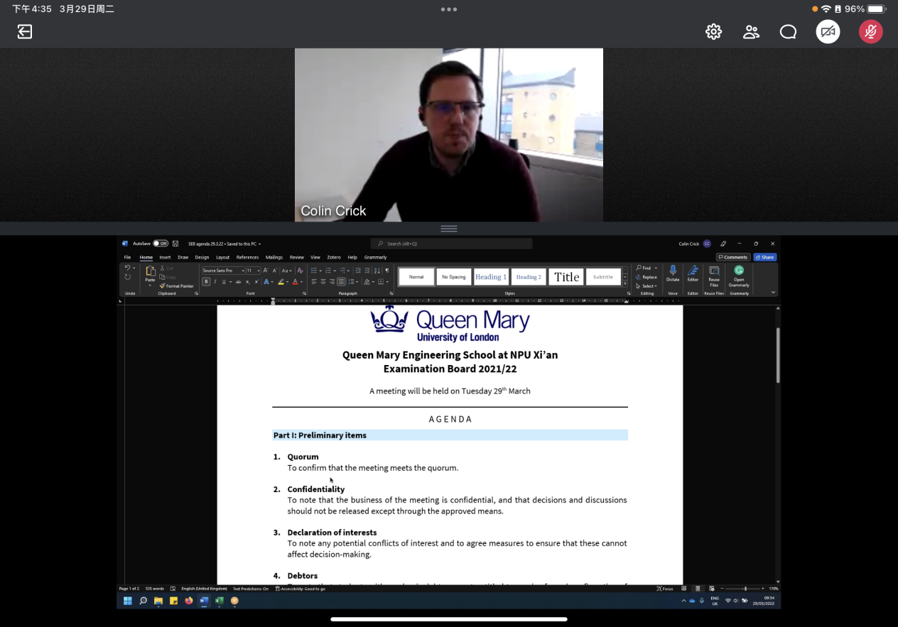 QMES held the online meeting of the final examination committee for the autumn semester of 2021-2022 academic year at 17:00 on February 16, 2022 and 16:30 on March 29, 2022, respectively. Professor Fan Xiaoli, Vice Dean of QMES, Professor Colin Crick, Off-campus Committee Member Professor Ge Wenjie, module convenor of this semester and staff of teaching affairs offices of both sides attended the meeting. The meeting was presided over by Professor Colin Crick.