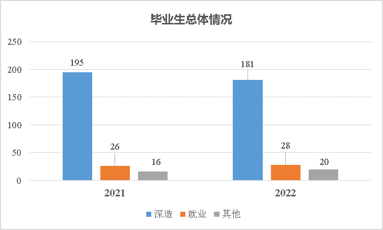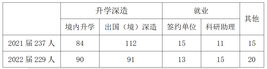 The amounts of the graduates of class 2021 and 2022 were respectively 237 and 229, and the rate measuring the percentage of students who continued to study both at home and abroad and got jobs was 92.5%. Among them, 11.6% students got jobs, 37.3% were admitted by domestic universities for further study, 43.6% went abroad for further study, and the overall rate of the further study was 80.9%.