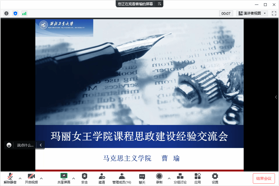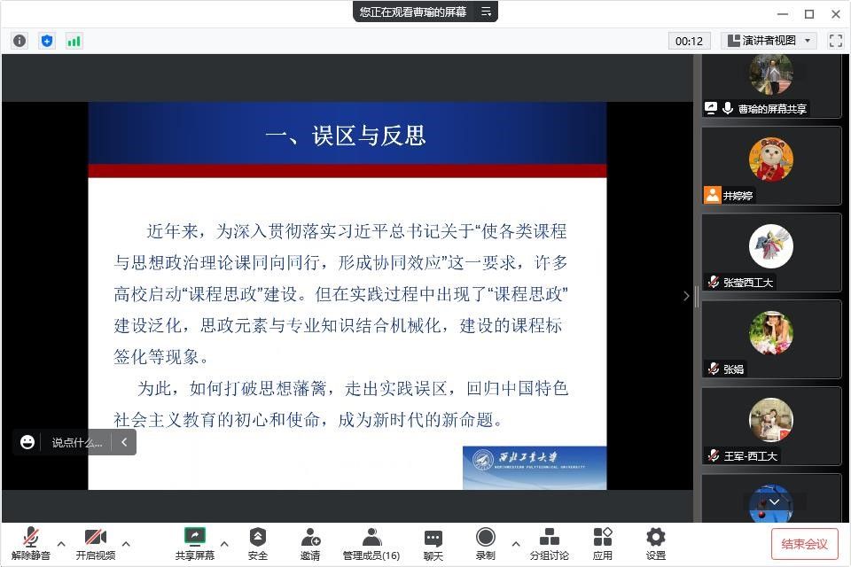 According to the requirements of NPU and in order to coordinate and promote the pilot work of the special reform of ideological and political courses construction of the School of Marxism, on November 23, 2022, QMES held an online exchange seminar on ideological and political work of curriculum, so as to implement the spirit of the 20th National Congress of Communist Party of China and Xi Jinping’s Educational Philosophy and the spirit of National Conference on Education, and coordinate and promote the construction of ideological and political courses and curriculum ideological and political work and implement the basic task of moral education.