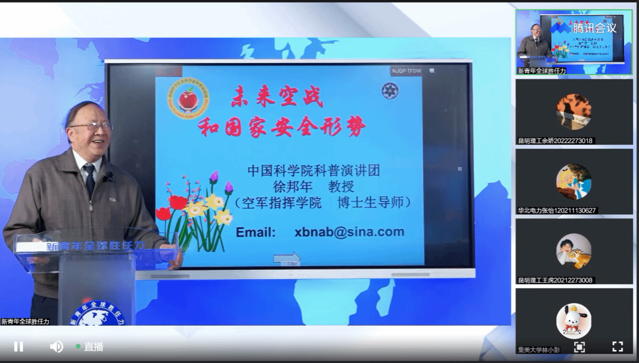 The first lecture of the “New Youth Global Competency Talent Training Program” of the spring semester of 2023 was successfully held online. The theme of the lecture was “Future Air Combat and National Security Strategy”. The number of real-time audience of universities across the country exceeded 2,300. The keynote speaker Professor Xu Bangnian, is a researcher, professor and doctoral supervisor of Chinese People’s Liberation Army Air Force Command College. He has profound knowledge in the fields of flight safety and stall spiral. He also has a deep understanding towards Chinese aeronautic and astronautic force construction and strategic goals.