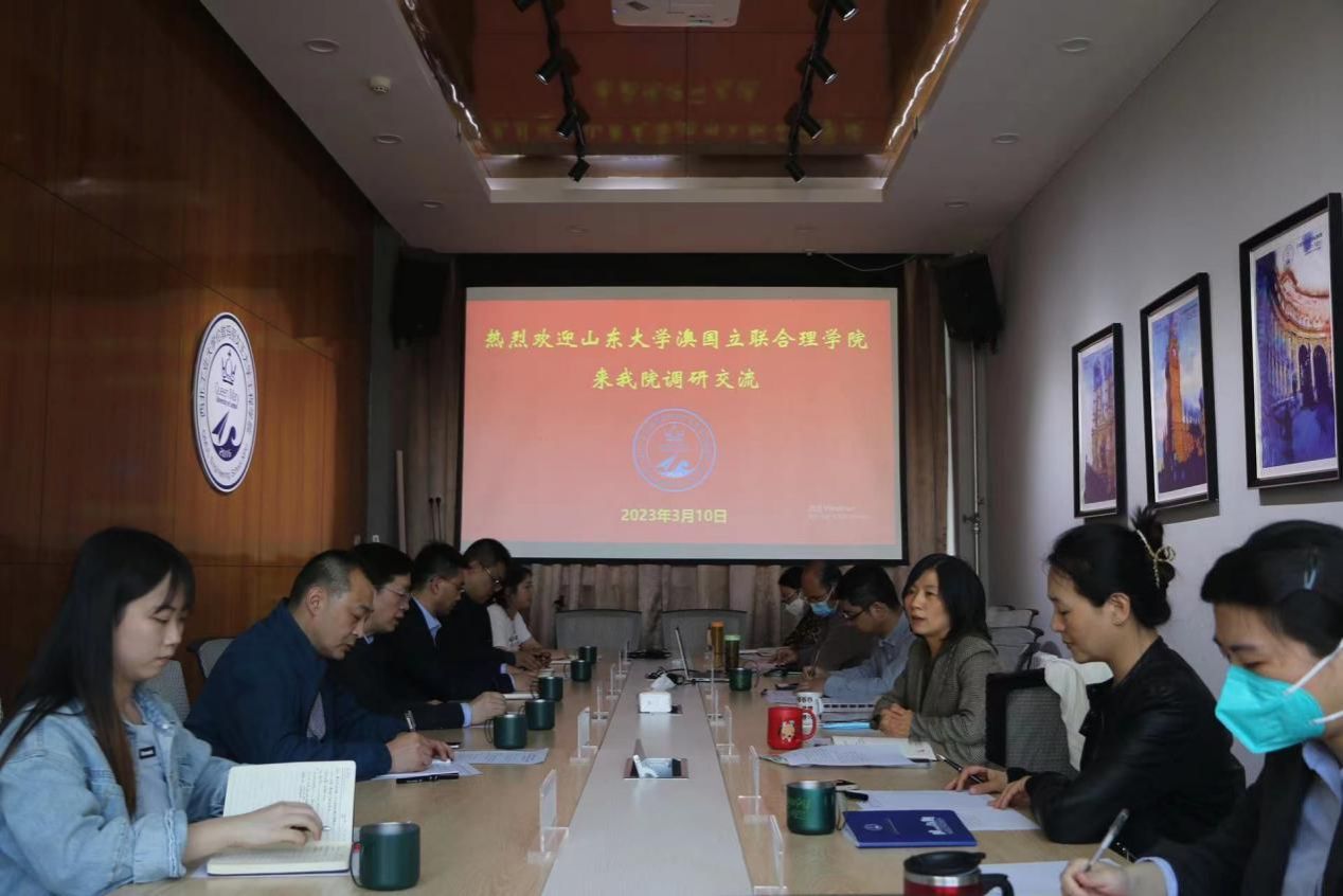 On March 10th, 2023, a group of six people from the Joint Science College between Shandong University and Australian National University(JSC) visited QMES for investigation and research, including the Dean Lv Guangshi; Liang Fengjun, Secretary of the Party Committee; Jia Hongfu, Director of the Student Affairs Department; Wei Fulin, Deputy Secretary of the Youth League Committee; Sun Xiaochen, Director of the Teaching Affairs Department and Wang Junhan, Administrative Assistant of the General Affairs Department, so as to study and implement the spirit of the 20th CPC National Congress, carry out the educational principles and policies of the Party, promote the action plan of rejuvenating schools and universities, and facilitate the cooperation between the brotherly universities of Sino-foreign cooperative education. Fan Xiaoli, Dean of QMES; Zhou Yongcun, Assistant to the Dean of QMES and other relevant personnel received them.