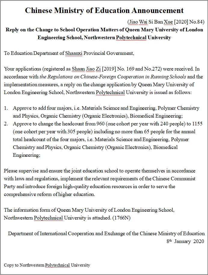 On January 8, the Department of International Cooperation and Exchange of the Chinese Ministry of Education issued the reply onthe Change to School Operation Matters of the Queen Mary University of London Engineering School, Northwestern Polytechnical University(hereinafter referred to as QMES) (Jiao Wai Si Ban Xue [2020] No.84), approving that Northwestern Polytechnical University (NPU) will carry out the double master degree of Chinese-Foreign Cooperation in Running Schools. The newly approved postgraduate programme includes four majors (or authorised degrees); Materials Science and Engineering, Polymer Chemistry and Physics, Organic Chemistry (Organic Electronics), Biomedical Engineering. In 2020, the programme officially enrols students with a duration of 3 years schooling (including 9-12 months inQMUL). The annual enrolmentheadcount is no more than 65 students in total per cohort, which is included in the national postgraduate enrolment plan and the NPU postgraduate enrolment plan. After graduation, students will be granted an NPU postgraduate graduation certificate, NPU masters degree certificate and Queen Mary University of London (QMUL) masters degree certificate.