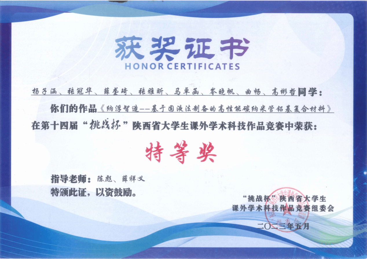 In May 2023, the closing and award ceremony of the 14th "Challenge Cup" Extracurricular Academic Science and Technology Works Competition of Shaanxi College Students hosted by Chang 'an University was successfully held in Weishui Campus of Chang 'an University, which was co-sponsored by Shaanxi Provincial Committee of the Communist Youth League, Shaanxi Provincial Education and Work Committee of the CPC Shaanxi Provincial Committee, Shaanxi Provincial Science and Technology Department, Shaanxi Provincial Science and Technology Association, Shaanxi Provincial Academy of Social Sciences, Shaanxi Provincial Students' Federation and Xixian New Area Management Committee. Two teams from QMES won the grand prize in the final for their projects "Nafu Intelligent Fabrication - High Performance Carbon Nanotube Aluminum Matrix Composite Material Prepared by Solid-liquid Method" and "Application of Liquid Crystal Polyimide Thermal Conductivity Composite Film in the Thermal Management of 5G Flexible Electronic Devices", delivering victories in the competition.