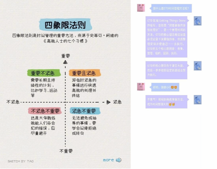 Student C has detailed planning and arrangement of the study and life. He/She also knows how to balance entertainment and study, and has the ability to distinguish the importance and urgency of different tasks, and the ability to collect, organize and execute tasks. He/She can make himself/herself finish the tasks according to the schedule. He/She is accustomed to using four-quadrant time management method (see the figure below on the left) and GTD time management method. For example, he/she first recorded the tasks that he/she needed to complete, including the experimental schedule, calculus homework, mathematical and modular operation, and reciting tasks of ideological and political courses and then drew four-quadrant diagrams according to the importance and urgency of different tasks, and finally finished them one by one according to the GTD time management method.