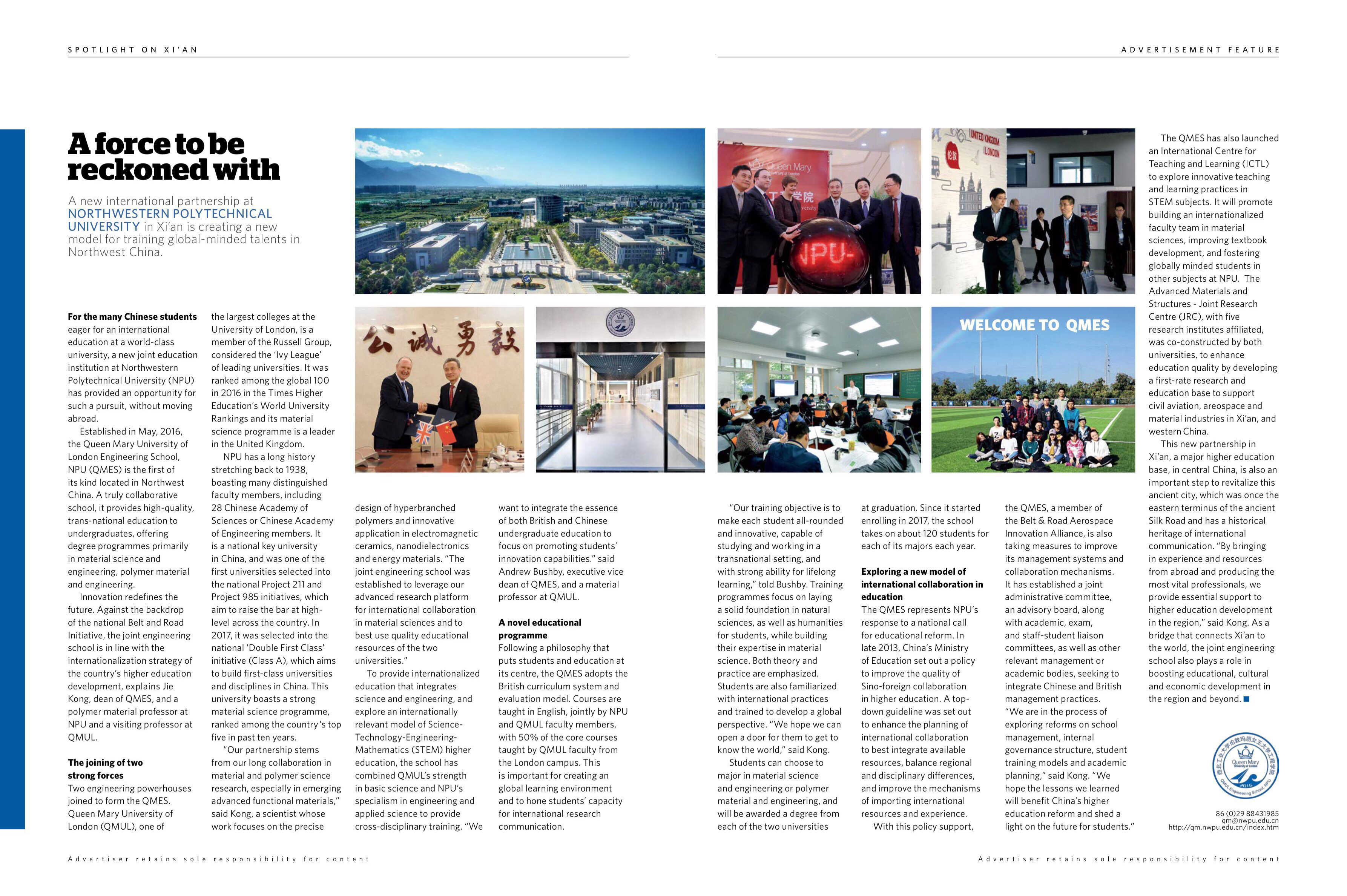 Established in May, 2016, the Queen Mary University of London Engineering School, NPU (QMES) is the first of its kind located in Northwest China. A truly collaborative school, it provides high-quality, trans-national education to undergraduates, offering degree programmes primarily in material science and engineering, polymer material and engineering.