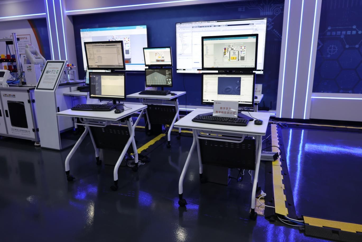 步入二楼,满墙的证书和发明专利将公司的活力和冲力具现出来,同学们路过一套套教学设备和竞赛装置,到达最具吸引力的智造系统沙盘。各个智造厂房整齐排列,由一条条机器装置轨道连接起来,共同构建出一套自动智造、互联互通的系统,这不仅是公司厂房的一个缩影,更承担着测控、纠错、虚拟实操的功能。随后,大家陆续参观了研发楼的实训区、办公区和调试区。他们从充满程序代码的屏幕、拆开机器臂表壳后复杂而精细的结构,以及机器人巧妙的位置标定方法中,获得了小小的创新启发。最后,他们来到讲厅聆听了两场讲座。