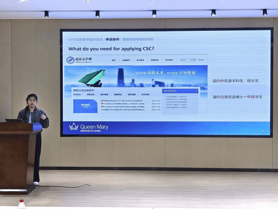 Sun Yutong introduced the differences between personal and CSC channel applications for doctoral degrees to the students. She combined her own experience to explain the application process and document preparation for the CSC scholarship. Miss Sun encouraged students to actively apply to prestigious overseas universities and strive for direct Ph.D. admission and scholarship offers. Regarding her decision to continue her Ph.D. studies at QMUL under the guidance of Professor James Busfield, the Vice Dean of the School of Engineering and Materials Science, Sun Yutong expressed its significant meaning to her.