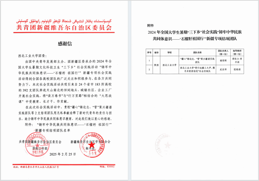 Recently, the Youth League Committee of NPU received a letter of appreciation from the Youth League Committee of the Xinjiang Uygur Autonomous Region regarding the 2024 Summer Social Practice Program. The letter fully acknowledged the efforts of the “Youth Spreading the Voice of NPU, Promoting Unity with Ethnic Minorities” summer social practice team, which QMES guided. The letter praised their selfless dedication in embodying the responsibilities and commitment of young people in the new era and their contribution to strengthening the education of the Chinese nation’s sense of community.